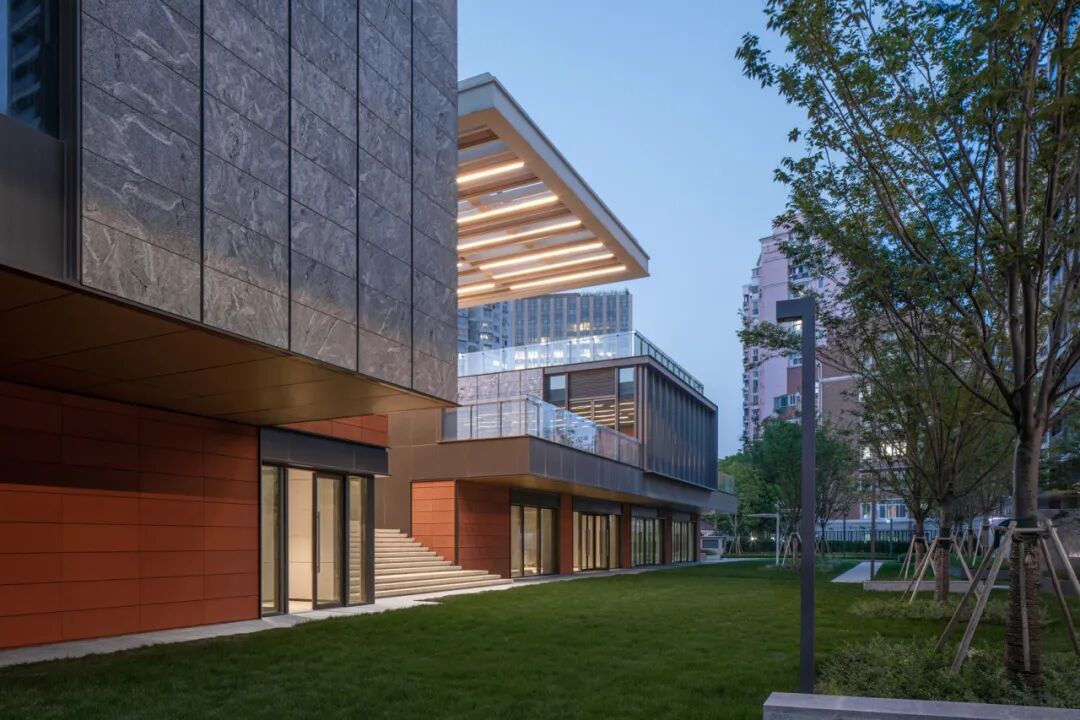 底层架空与商业结合形成的灰空间、大挑檐与台阶的组合将商业界面延伸到社区内部,延伸了开放、共享的理念,提供了更自由、非正式的、蕴含生活气息的场所交流空间。夜晚,建筑内部的灯光透过构架形成独特的视觉效果。