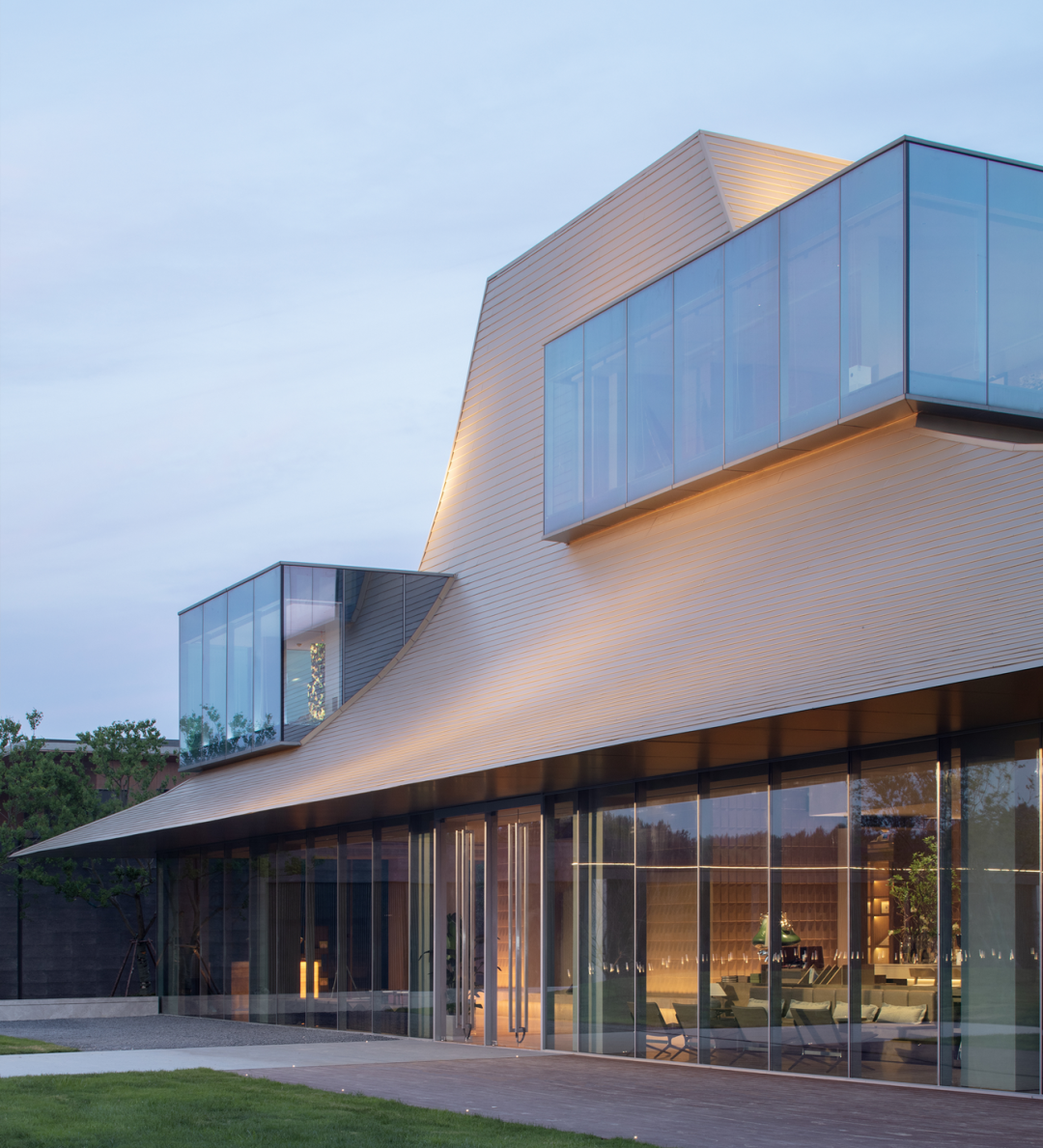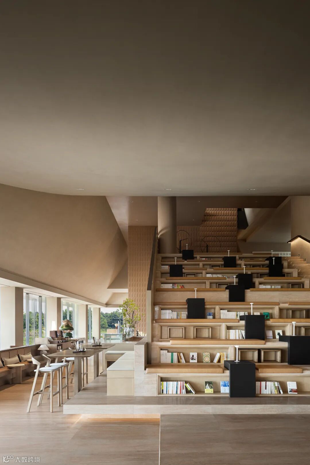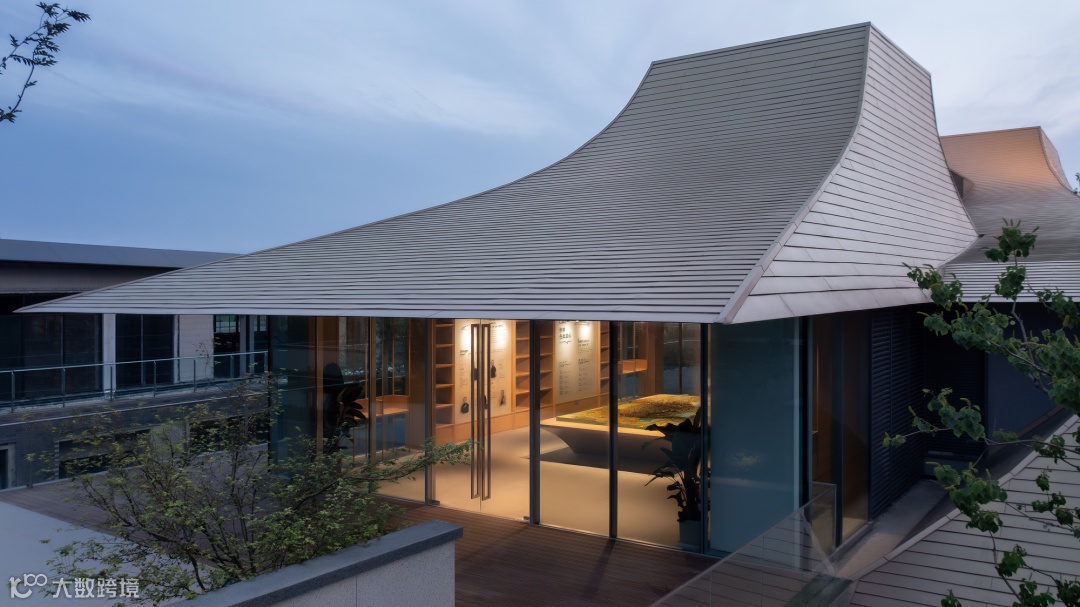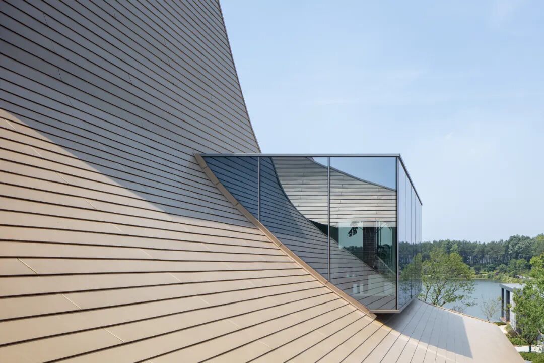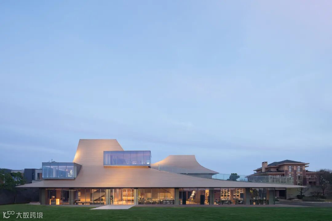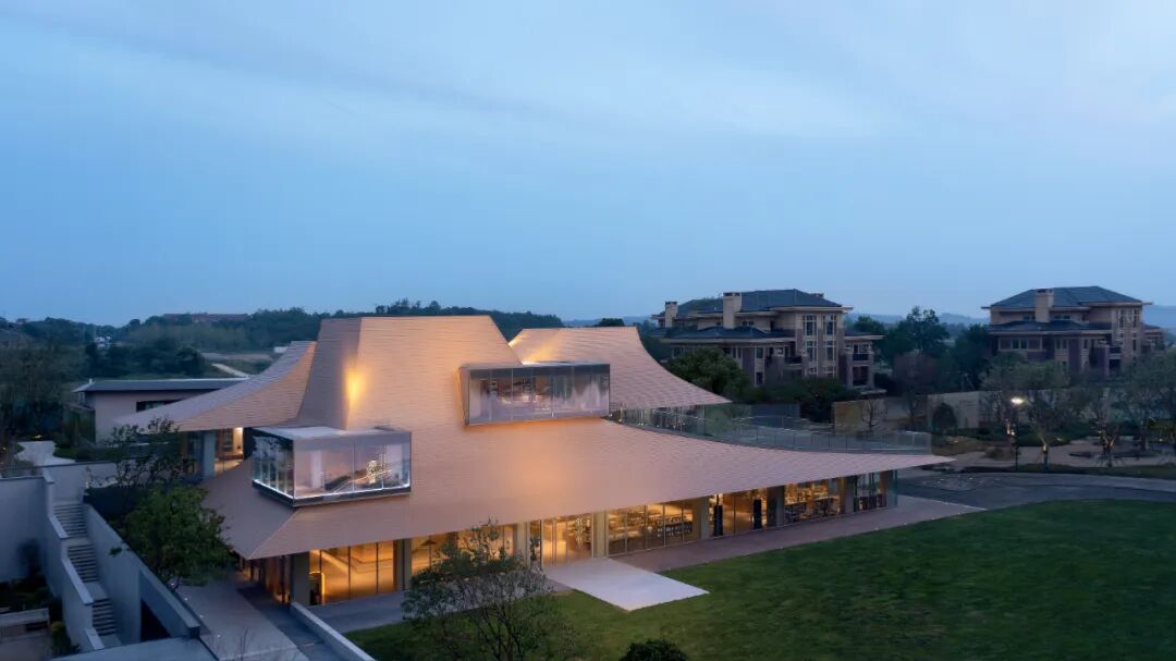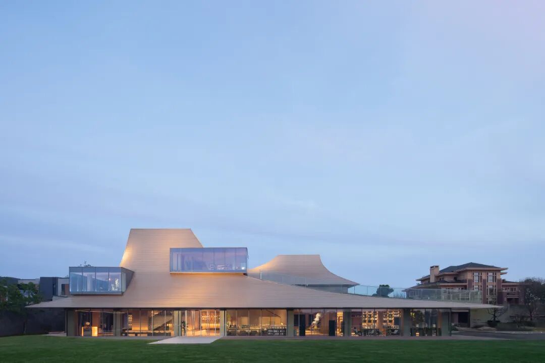 场地选址直面蜿蜒灵动的湖岸线,树林环绕,东、南两侧通向社区,北侧前场水岸宽阔,西侧与集散广场接壤,拥有观赏落日的完美视野。场地的自然属性首先决定了建筑布局的朝向——直面西北,向自然过渡延展;背靠东南,为社区提供方向指引。设计将阅读、交流、展示、剧场等功能模块进行组织,并覆盖连续的大坡屋顶,向内集聚,向外延伸。