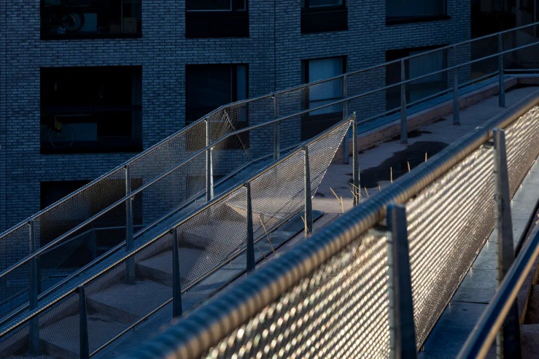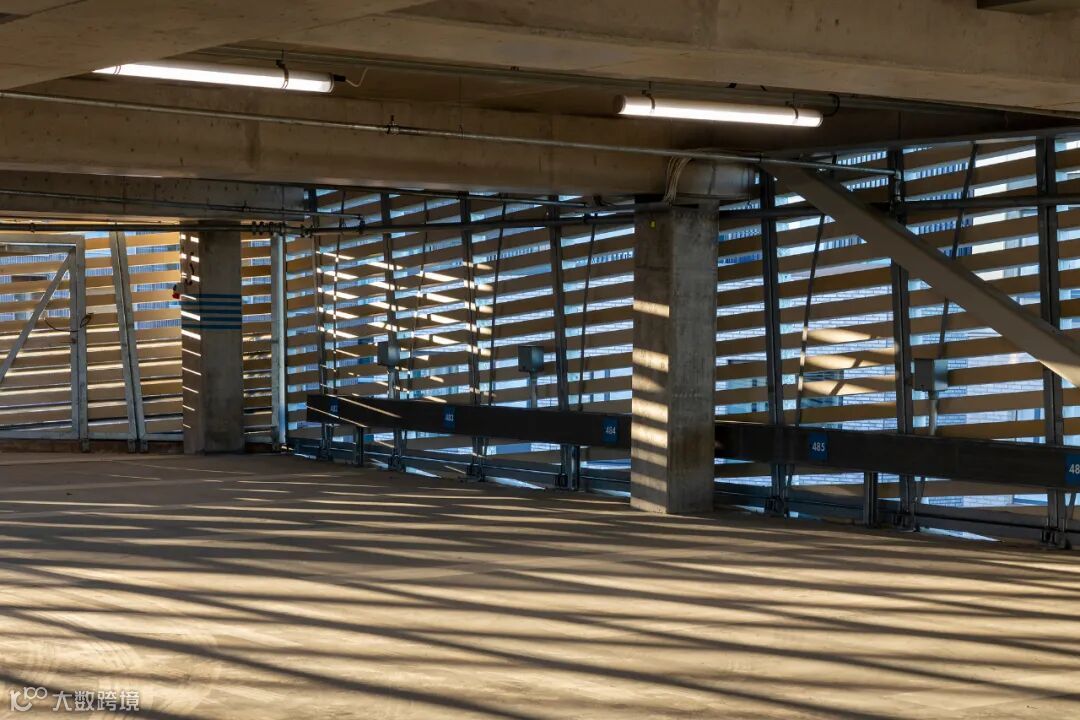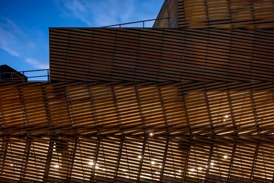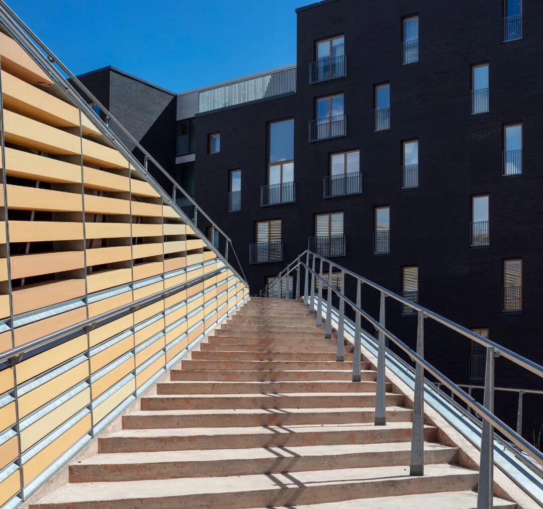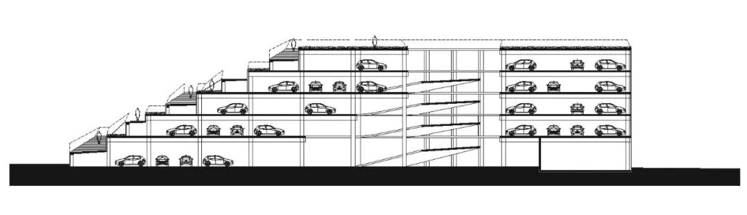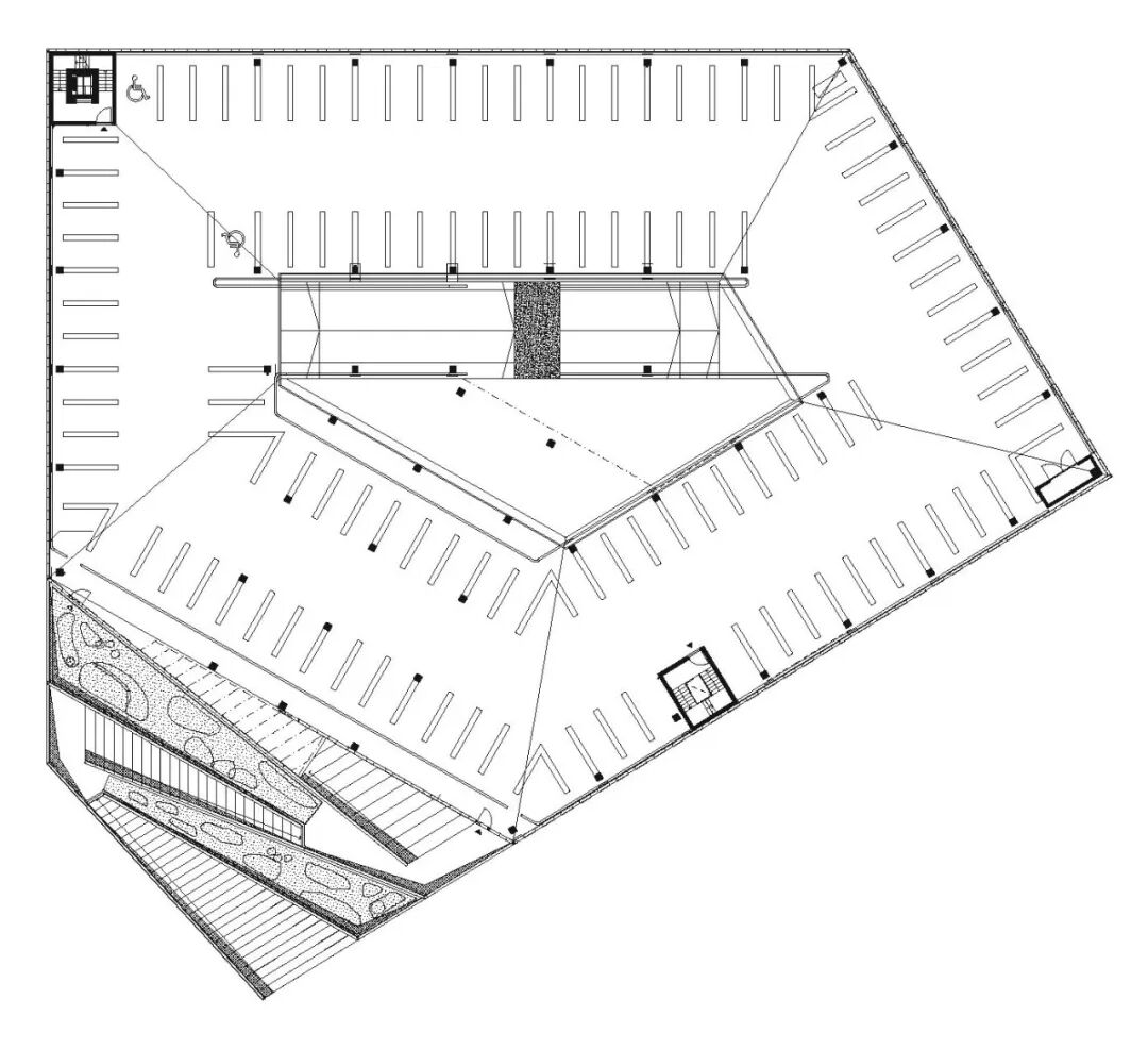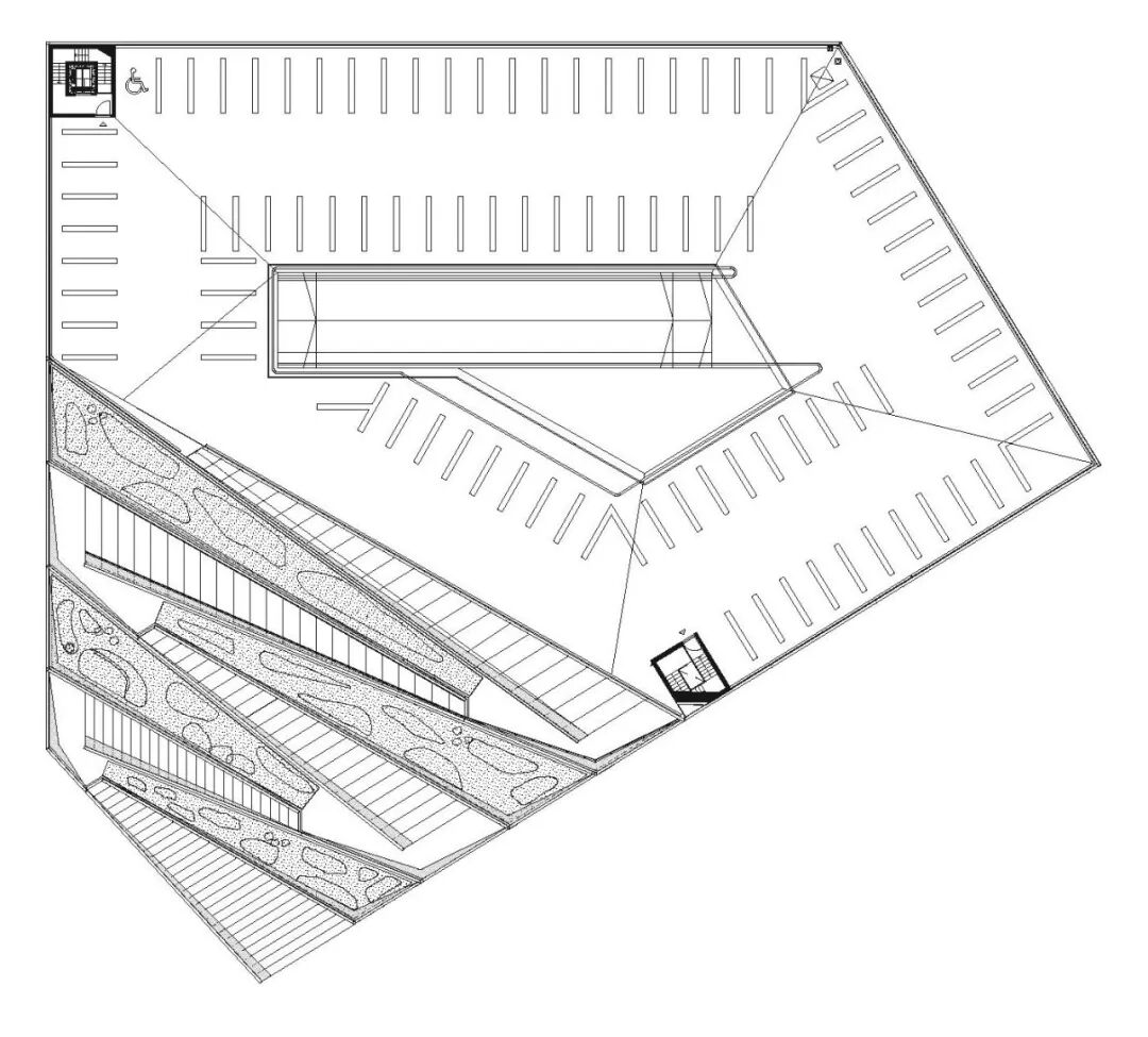The southern side of the building falls back from the entrance square, stretching the ground-level public space as a terraced park all the way up to the roof. This solution allows the residents of the surrounding apartment blocks to access their cars by hiking up the terraces to the correct floor instead of taking the elevator there. The terraced area can also be used for picnics and sunbathing.