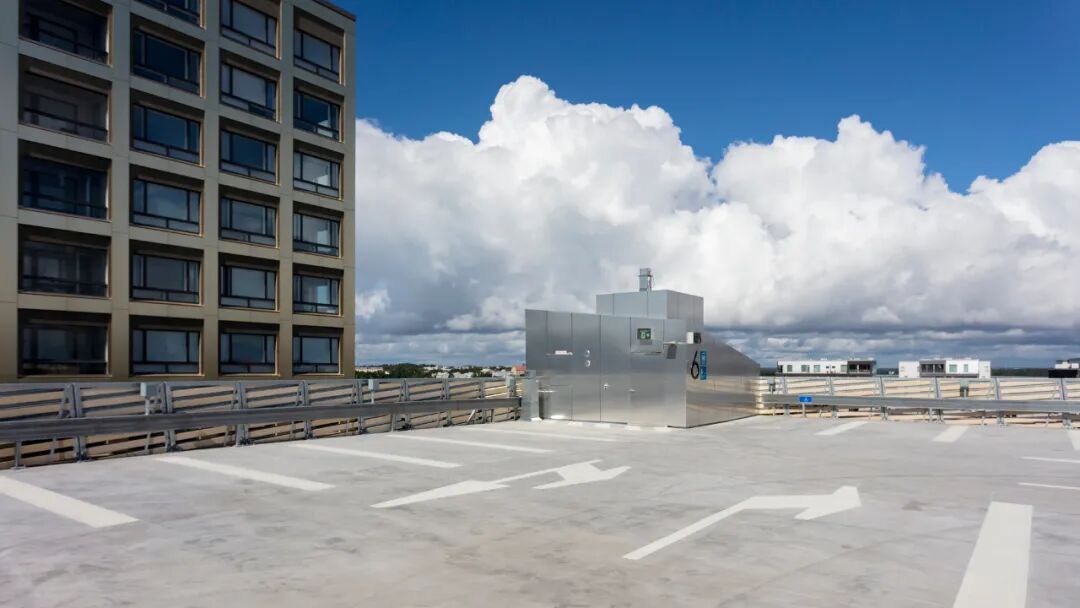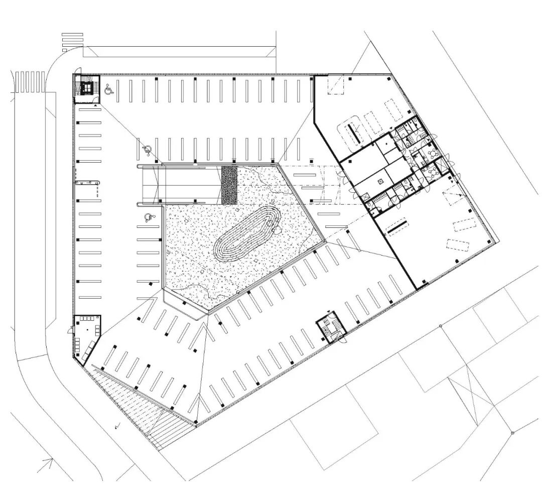The new five-cornered, five-story-tall Saukonlaituri parking facility consists of six circuits of parking for 600 private cars around a landscaped central courtyard with boulders, moss and ferns. Five of the circuits are covered and the sixth one is located on the roof. The courtyard has a double function: it both forms a light well bringing daylight down to the lower parking circuits and serves as a stormwater retainer and snow deposit.