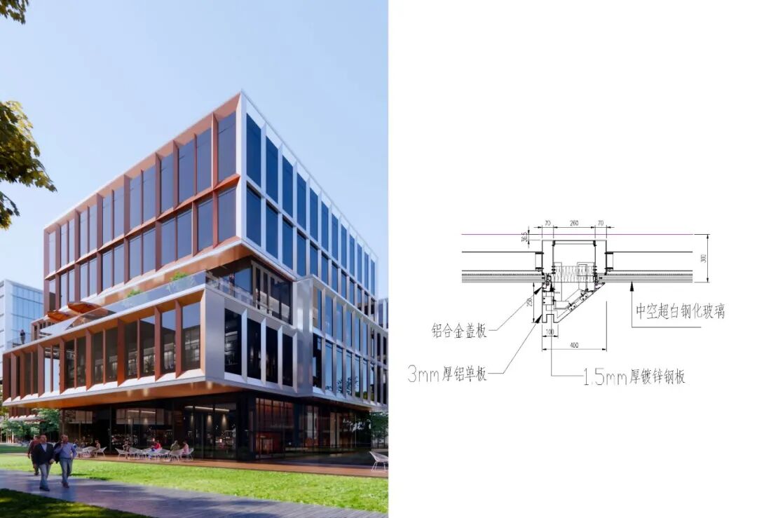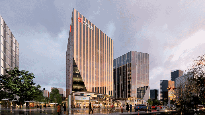 塔楼低区及多层办公朝向中央庭院的立面,局部采用亲和力的暖色系点缀,增加辨识度与氛围感。
