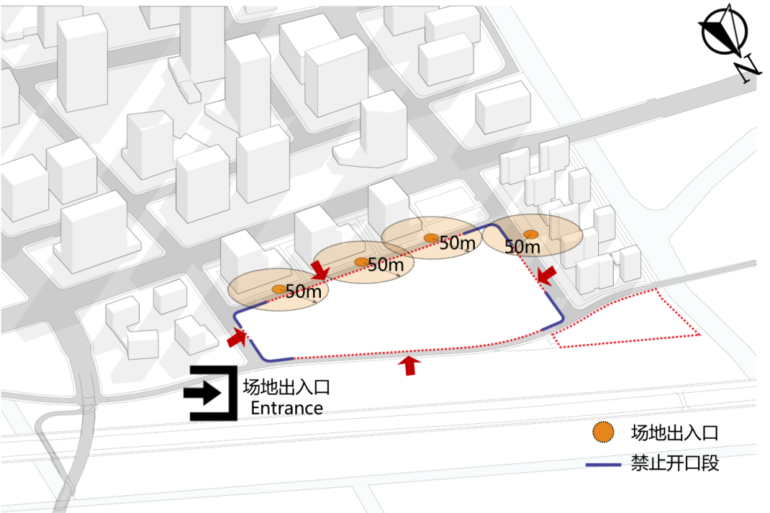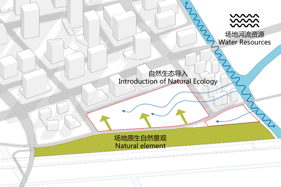 场地周边被人才公寓,居民住宅和高密度办公园区包围,为了隔绝外部的喧闹,设计营造了一个内聚的广场,以城市公共空间入口为导向,切割建筑体量,形成街道与里弄,营造现代感的超级街区以及呼应市井文化的“里”文化。