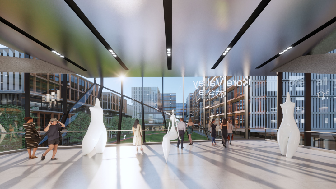 园区南侧沿街高层及展示楼,通过多层级的连廊系统,结合景观打造尺度怡人、功能便捷的人行体系。