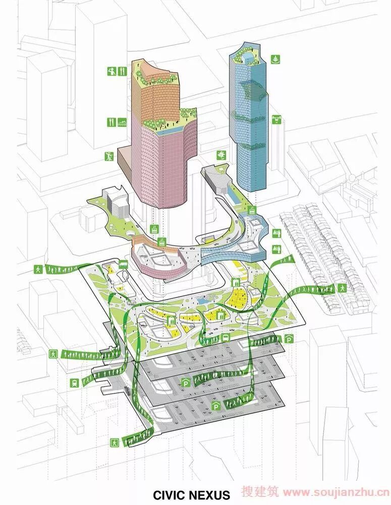 十二个塔楼,逐渐向底部收拢,非常明确有序的环绕在中部巨大的中庭空间,提供了五十六个没有拐角以及前后之分的教室,灵活的体量形式使得教授可以更容易接近学生,并促进个体之间更紧密的合作。
