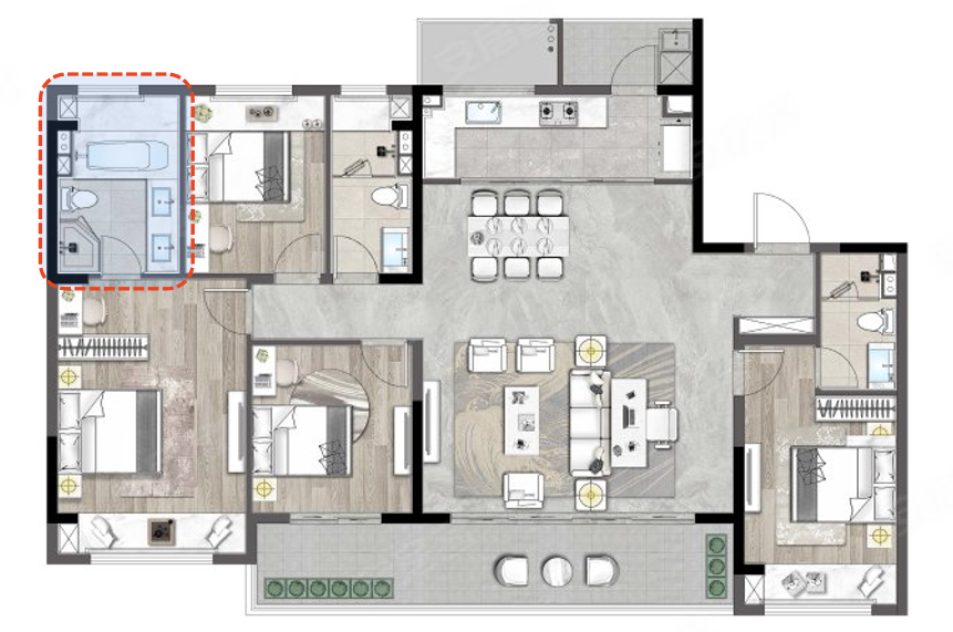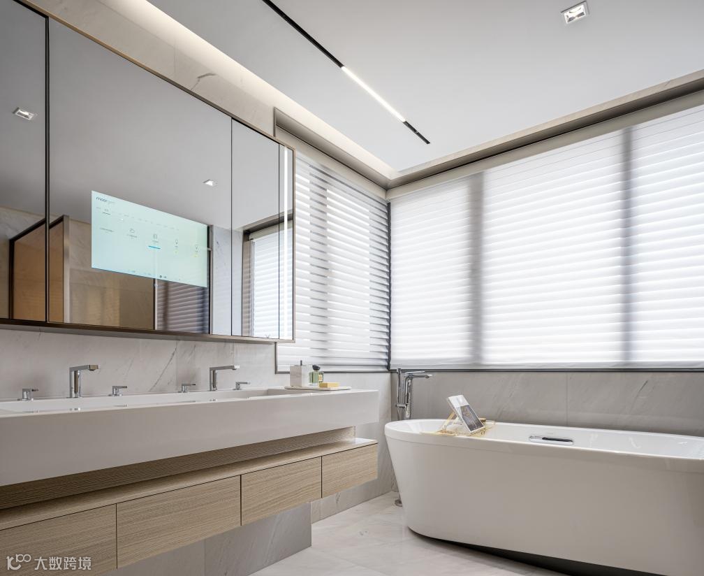 主卫也是更加奢侈,全部采用双台盆+独立淋浴房+独立马桶间+日光浴缸,舒适度堪比星级酒店,夫妻二人即使同时使用也都毫无压力。