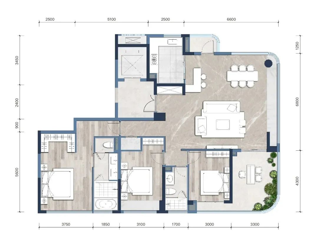 入户电梯厅+私密玄关,独具归家仪式感;LDKG客餐厨阳台一体化设计,各空间既独立又能相互交流,营造更融合的家庭氛围感。约5米大尺度餐厨+约6.6米大面宽客厅,家庭聚会、社交宴会通通满足。整个空间不仅视觉冲击力强,6.6米的横厅更是让家庭公共空间更加复合,更具成长性。