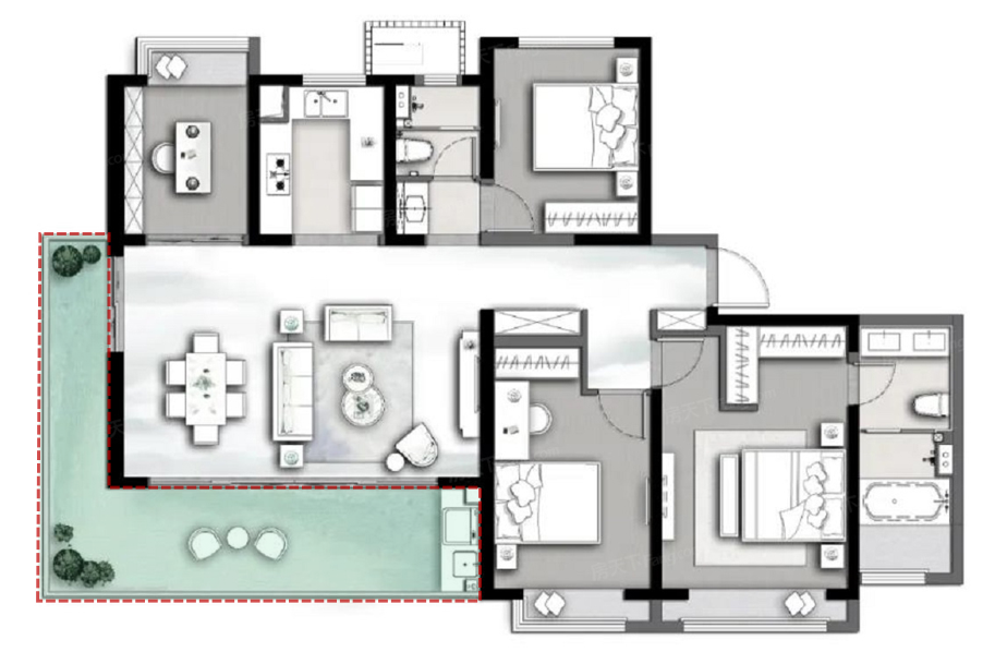 客厅面宽约6.6米,配上面宽约9.2米的三开间阳台,带来270°的空间视野,地方足够大,还可以自由布置。
