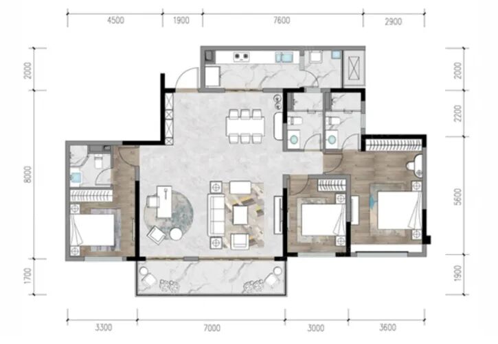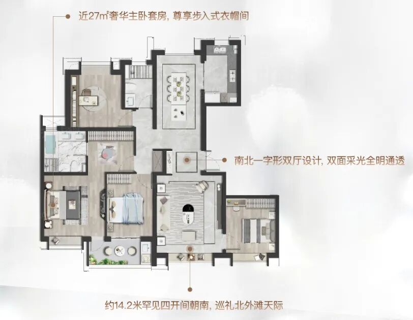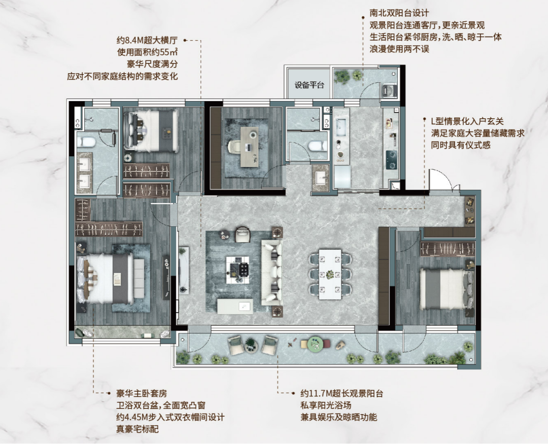 成都佳兆业麓山壹号,约169㎡户型,约8.5米阳光横厅,空间通透。超大面宽横厅,让客餐厅共享南北向阳光,在有限的面积里,尽可能让视线拓展开,居家更舒适。