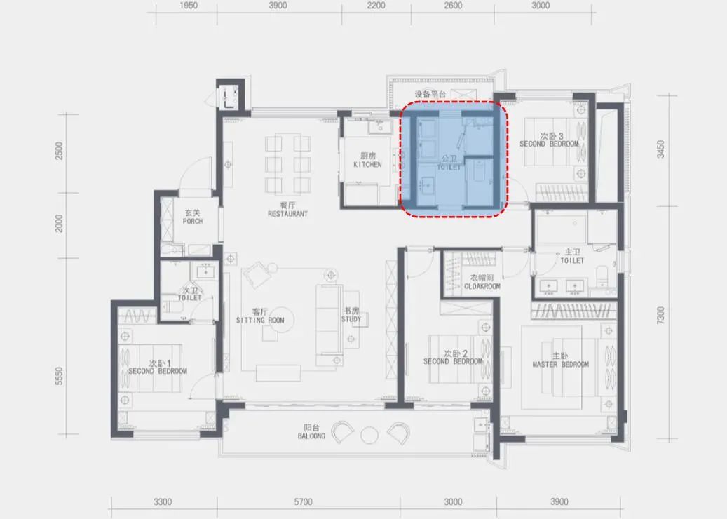 杭州棠玥湾洋房约164㎡户型的公卫:北面是可放洗衣机、烘干机的家政区和淋浴区,南面是台盆和马桶。南北区之间增加了一道移门,这样上厕所和洗澡就不会互相干扰,提高了公卫的使用率。