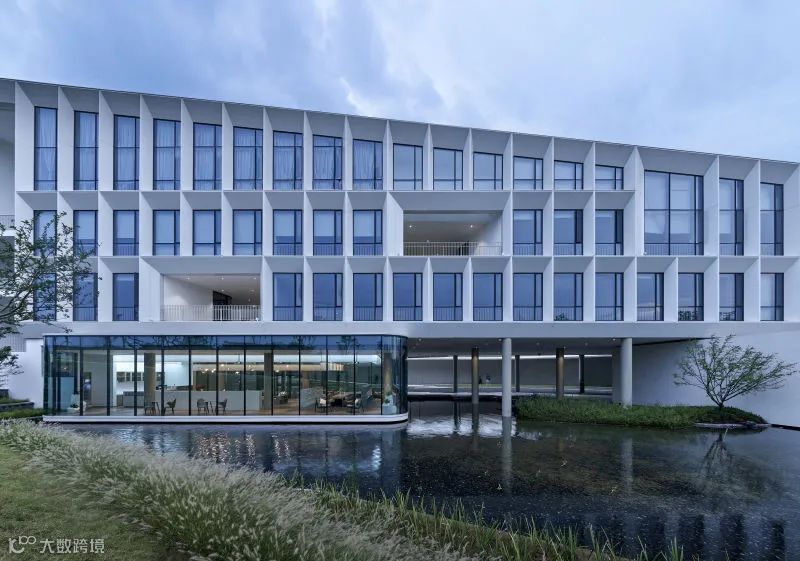 轻盈线条勾勒出建筑外立面的空间边界,施以精细的铝型材,为外立面奠定了简洁明晰的基调。大量玻璃材料的运用一方面弱化了建筑本身结构的厚重感,另一方面倒映着周边的天光云影和水丰草茂,更进一步融入到周边环境,建立起建筑与自然模糊的边界关系。