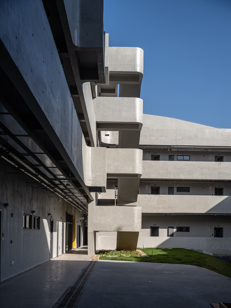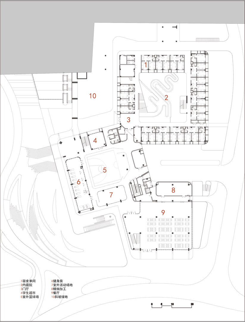 宿舍大院是以自然为主题;宿舍中院利用清水楼梯体现雕塑感;南区运动小院以半场篮球为核心;自习室则将体量剖切拉开,通过两片剪力墙挤压出静谧的“缝之院”。