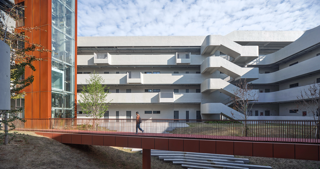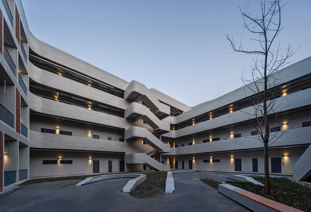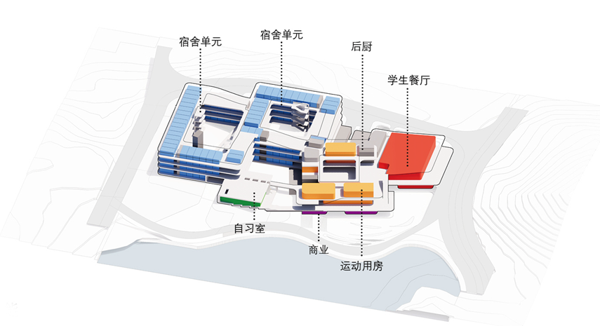 叠台是组合建筑零散的功能体量以形成聚落。北区2栋宿舍楼、自习室及南区活动中心、学生餐厅等5个不同的建筑体量顺应场地高差变化由北向南,由高到低依次跌落,形成了一个复杂的综合体。