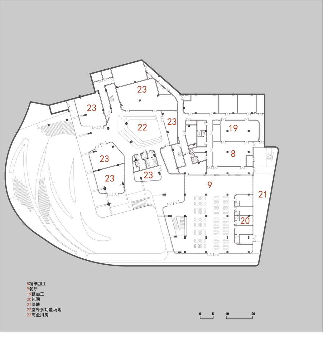 5层“台”以错动的形式咬合,左右腾挪适应用地红线的同时创造出诸多大小不一的开放庭院。这些院落采用了适应原始地形与现有方案体量的柔性设计,创造了各自的身份特征。