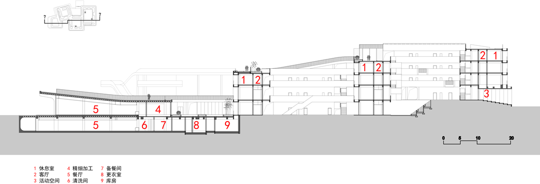 在生活中心中,“叠台柔院”的设计策略,自然而然地创造了一个在水平和垂直两个方向同时展开的屋面。