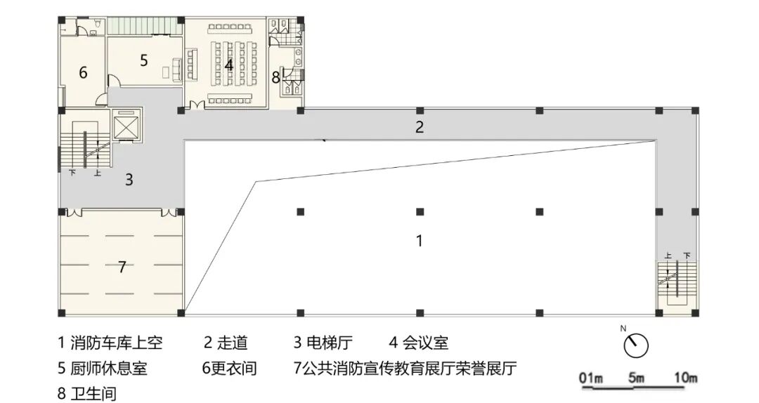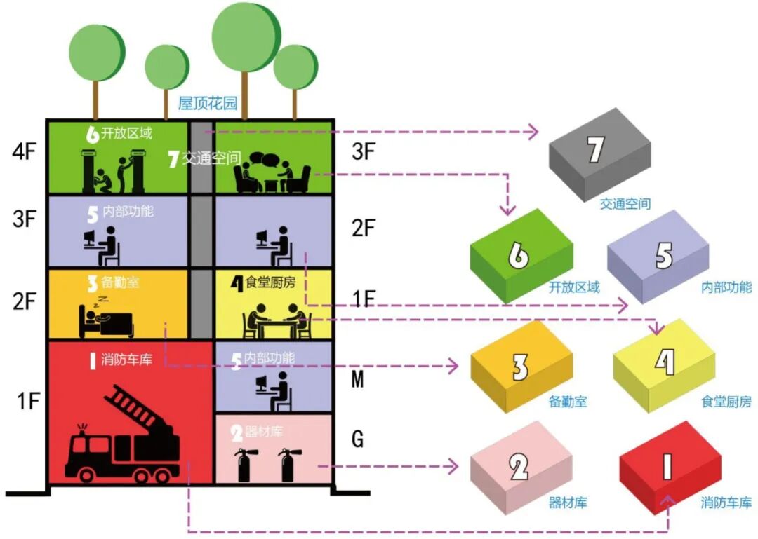 消防车临街直接出车,首层停放8辆消防车,大大提高出警效率。用地南侧为主要出入口,消防员和参观者由此进入消防站。对外开放区位于一层、夹层。消防车库面向布龙路, 一层为门厅、餐厅、充气室等,二层为备勤室,干部备勤、中队办公等,南侧配套洗室和淋浴间,三层为业务用房和业辅用房。地下室主要功能为应急救援仓库和设备用房,入口在建筑西南角。