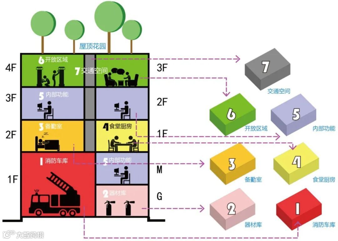 “标准化”着重于消防站的主体功能,包括消防车库、备勤室、地下室、训练塔以及标识。这部分的设计内容因与消防站业务紧密相关,采用标准化设计的模块能够有利于实现规模效益,统一外观、统一标准。同时有利于提高消防效率、方便出车、缩短设计周期,以及减少成本、便于后期使用和维护、提高消防培训效率、便于统一管理。