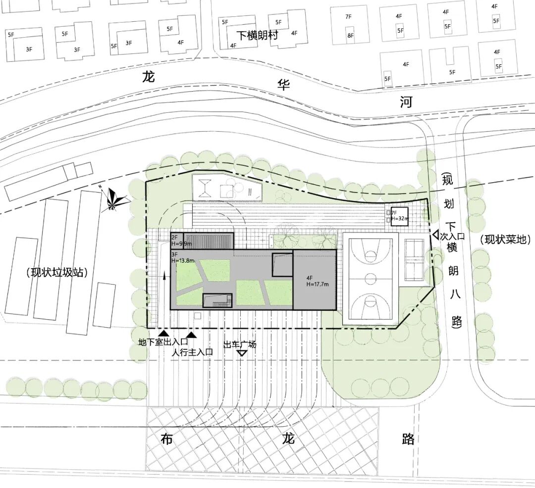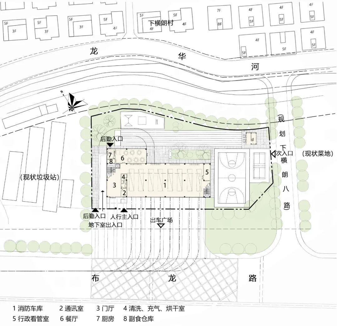 本项目用地南侧与布龙路相邻,设置主出入口,包括消防车库出车口及出车广场,供消防员出警、回车用。西南侧为人行主出入口,供消防员和参观人行进入。西南端是后勤及地下室出入口,东侧设人行次入口。我们将消防训练场地、跑道和篮球场设置在北侧,留出尽可能大的花园作为与下横朗村之间的“呼吸空间”。