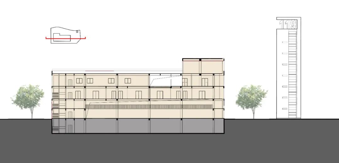 由于大浪消防站用地狭小,如何在局促的用地上科学合理地布局消防站,成为设计最大的挑战。若完全按照深圳市通常的退线要求,用地面积和形状将无法满足任务需求。同时,建筑要与周边场地环境协调,因此大浪站的退线,在论证和与规划部门沟通后,争取到较为合理的少退线:东侧退3.4m、南侧退3m,西侧退3m,北侧退1.6m。