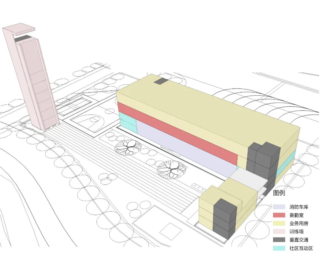 项目用地面积4099.57㎡,属于一级消防站,可停放8辆消防车,容积率0.97,总建筑面积5174.49㎡,其中计容建筑面积3991.69㎡,不计容建筑面积1182.8㎡,包括一栋3层消防业务大楼和一栋7层训练塔及一层地下室,是一座典型“集中式”消防站。
