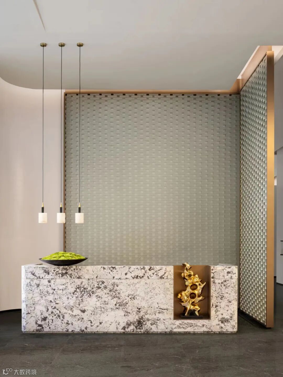 【 可堂 】一侧墙上的山水画卷,以凝练灵动的笔墨呈现,婉婉诉说着中海·源境精致而优雅的莞邑文脉;另一侧参照高端酒店设置接待前台,展现东方意象之美与待客礼仪之道。