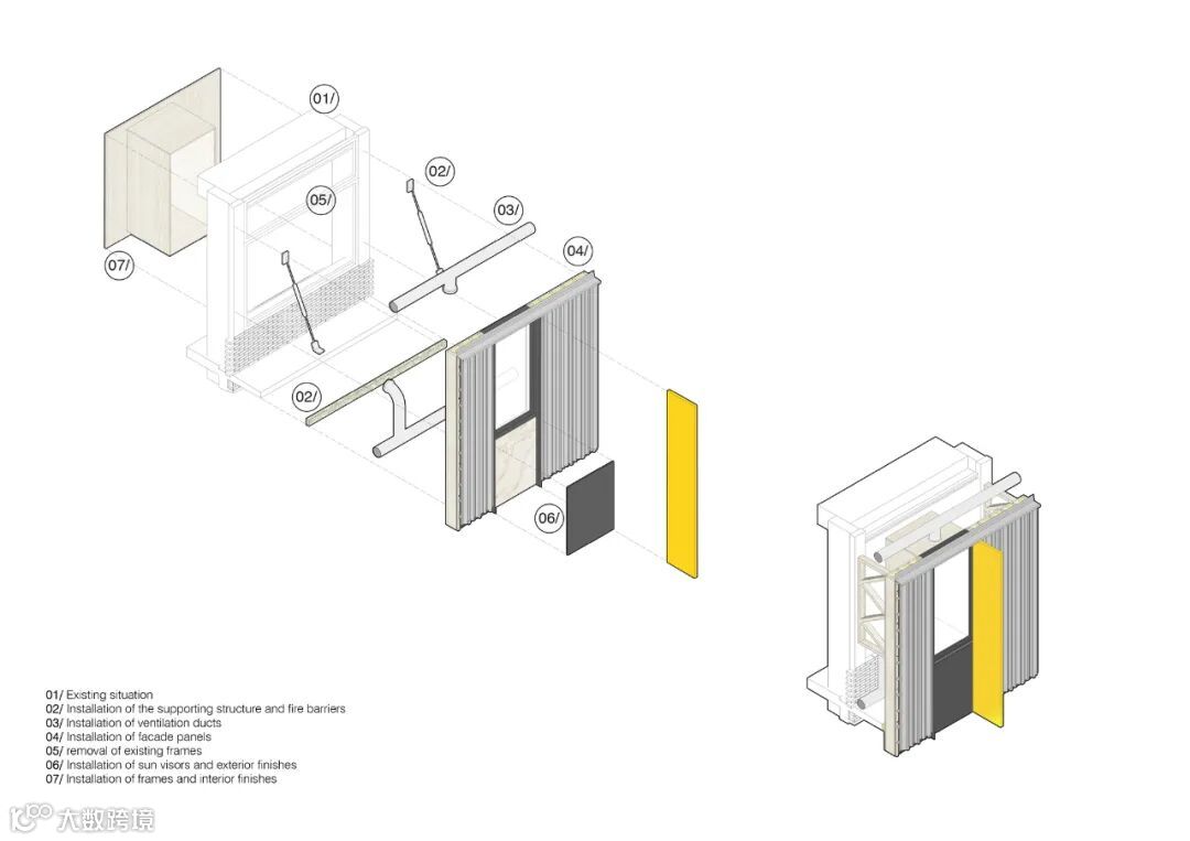 The project also gives the building a new architectural expression, fully consistent with its construction system. The materials used are simple, and light and emphasize the connections between the panels.