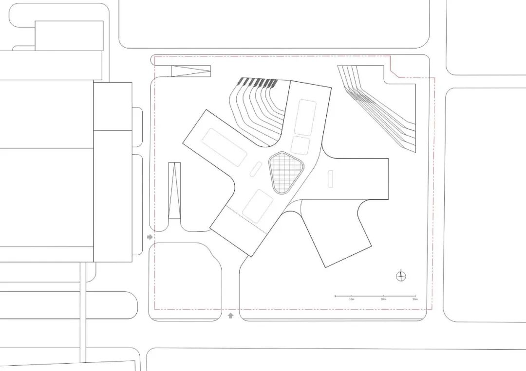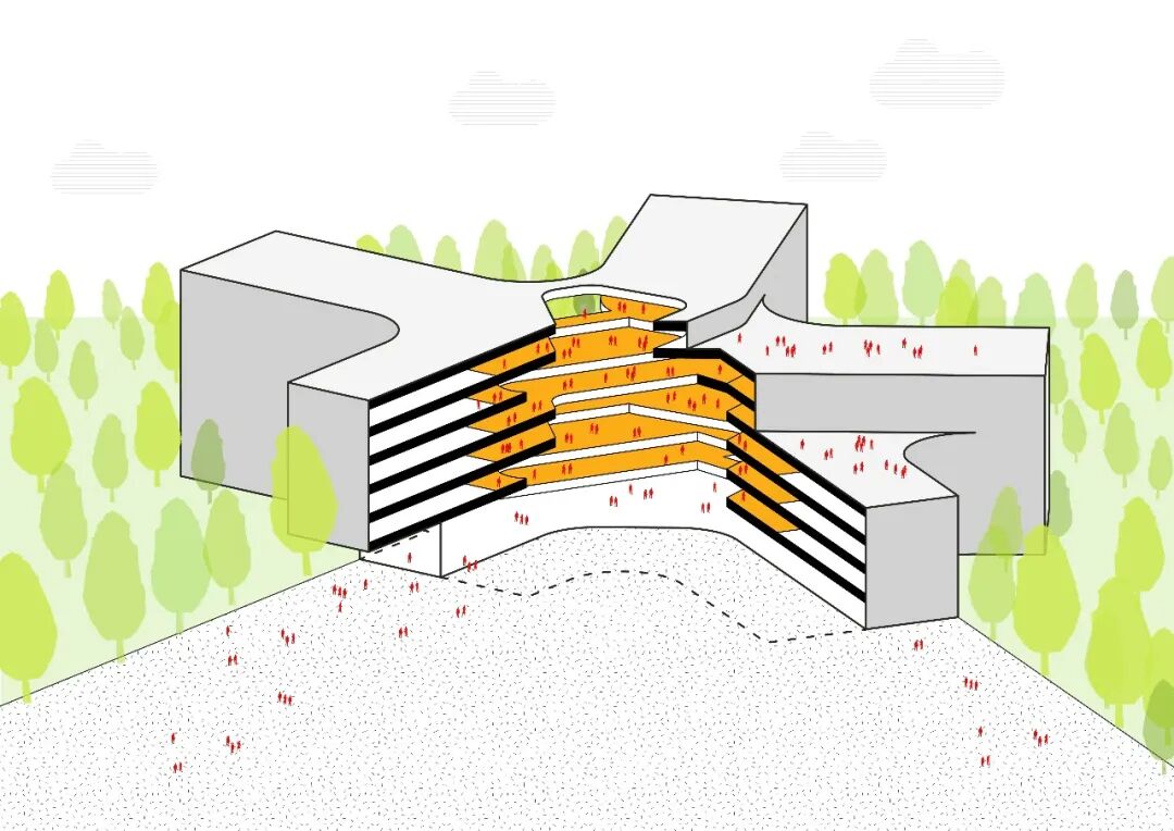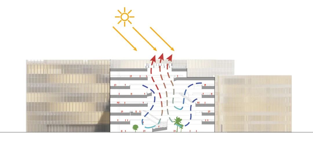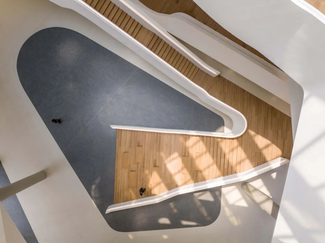 通过建筑的造型自然形成了五个主题室外庭院:到达广场、运动广场、下沉式花园、露天舞台,以及开放绿地。健身中心与运动广场相连,员工食堂直通室外下沉式花园,赋予员工配套设施丰富的自然光线和景观。丰富的室外亲自然空间被垂直布局在建筑的各个高度。建筑的五楼和七楼分别设有屋顶露台,从内部中庭可以轻松抵达,为员工提供了社交、非正式讨论以及灵活办公的室外空间。
