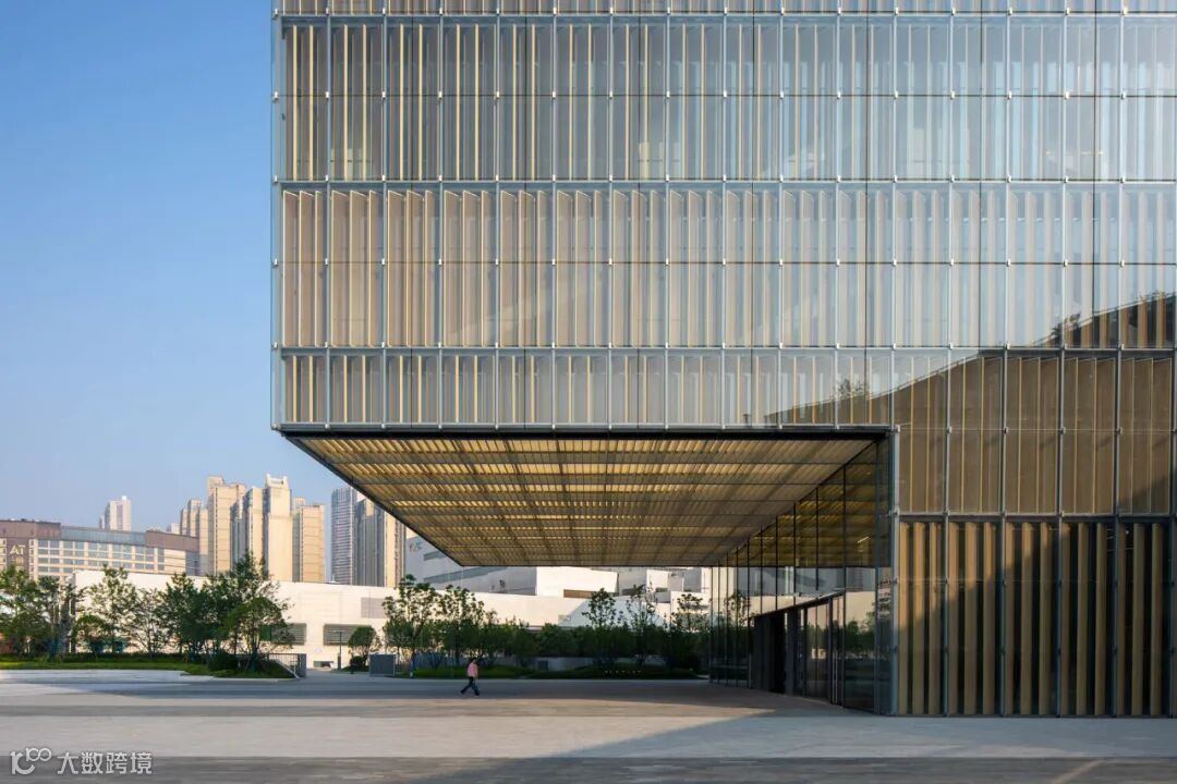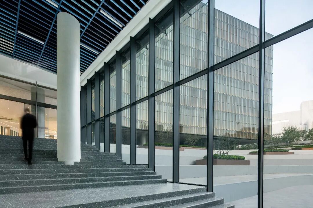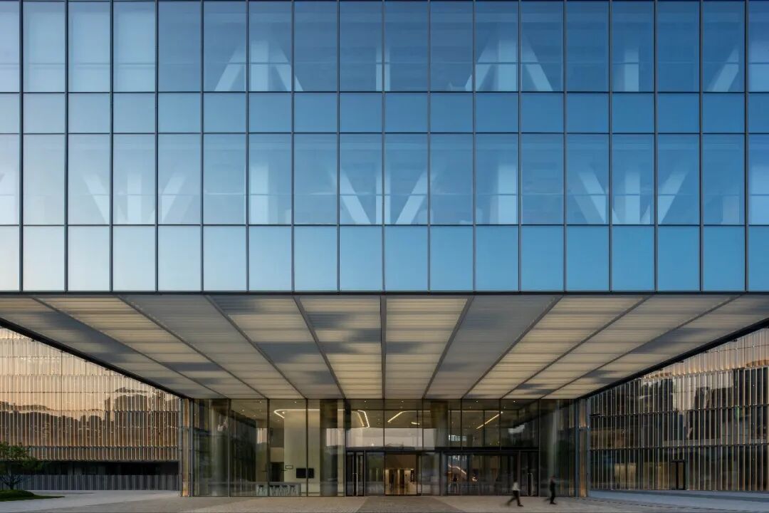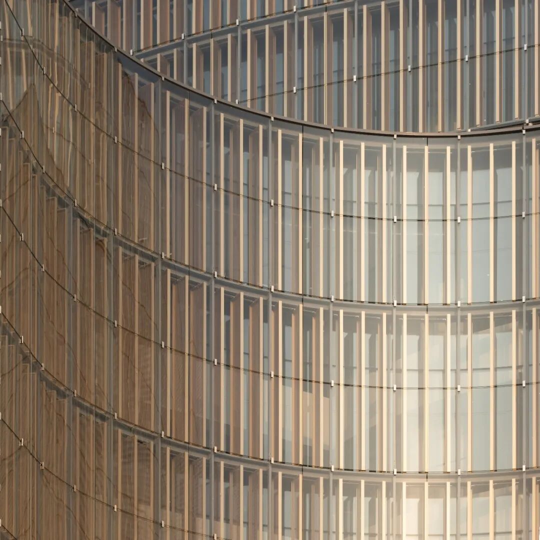 设计团队从中国传统窗棂中汲取灵感,结合高科技幕墙技术,打造了智能的三层立面系统。建筑立面可以根据周边环境和光线条件的变化,通过传感器和内置电机来控制中间层遮阳百叶进行旋转,进而调节透过外立面进入建筑内部的光线和热量。智能立面系统使建筑能够优化自加热和自冷却性能,可以更好地应对高温、暴晒、强降雨等各种极端天气,具有出色的节能效果,为员工营造舒适的室内环境,并营造出多变的建筑外观效果。