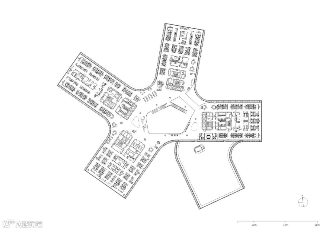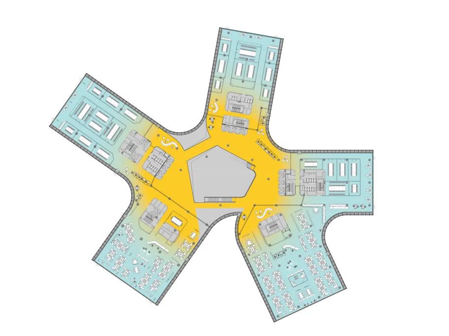 位于建筑五翼的办公空间,更多为员工提供深度思考及专注办公的空间。灵活的空间布局也可以更好地满足未来办公的增长需求,打造一个混合空间来满足员工社交、学习、协作、专注等各类工作模式。高效的平面布局,确保各个办公区域的员工都可以以最短的距离抵达中庭。