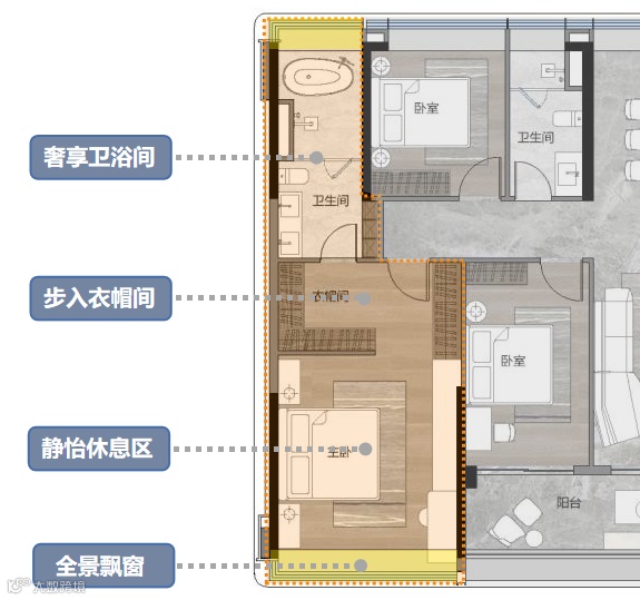 奢华主卧总统套,独立景观卫浴空间+衣帽间,实现“主卧小家化”,更私密从容,且270°揽窗外风景。
