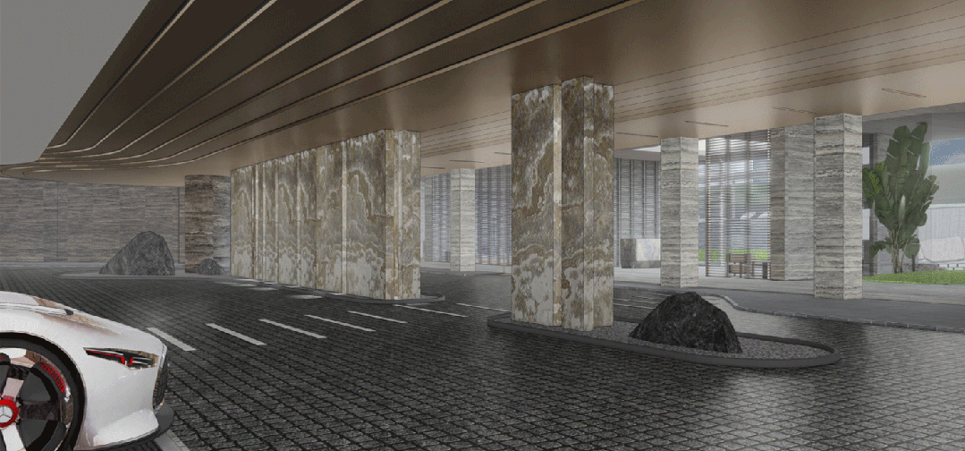 地下环岛式落客区构建形成酒店式落客前场,又是另一种新奇且明亮的归家空间。遵循精致化、功能化,通过空间的功能串联,提升入口归家感受。