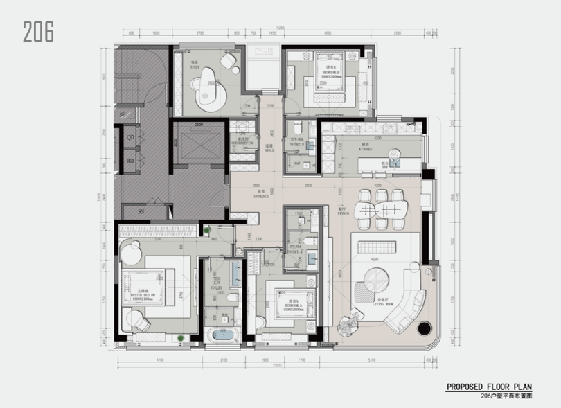 ▎ “L”型弧转角,实现270°观景,206㎡四室户型