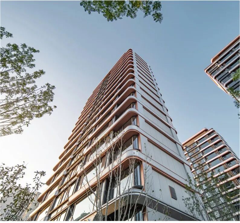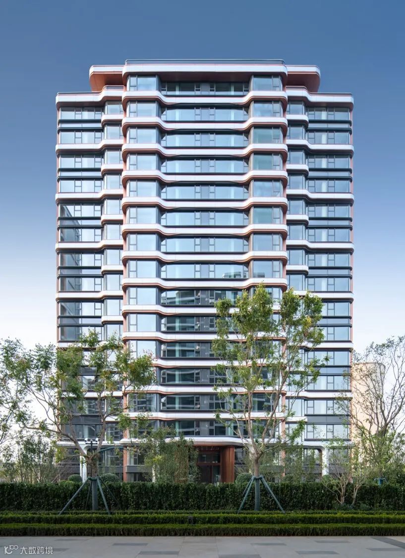 为了强化与绿轴的联系,我们采用了曲线元素。整体以纯粹的横向曲线,搭配弧形转角玻璃,跳脱居住建筑常规的方盒子形象。