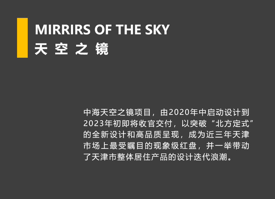 天空之镜项目中,我们给出的答案是:立足当下和在地性,回归建筑学本源,从居住者普适性需求和特定场域气质出发,围绕居住建筑内在的空间性和外在的视觉语言,将生活的温度融于日常,打破定式,创造超越天津乃至北方区域原高端居住产品的全新设计谱系。”