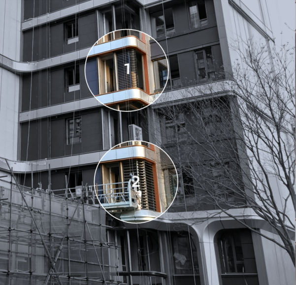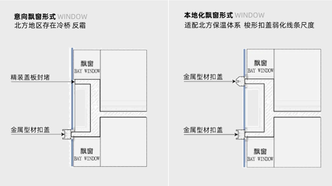 在最初的方案设想中,我们希望将上下层飘窗做成统一连续的整体,形成极致的立面观感。但在经过论证后,此种做法存在两个弊端:首先内部土建窗台与窗进出位之间的施工误差难以控制,影响户内精装;其次飘窗空腔部分。在冬天受热不均会使玻璃形成返霜。