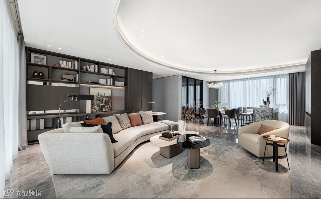 出于对户内感官和形象审美的高度追求,我们将客厅及阳台窗做了落地窗的设计,并且端户采用了弧形飘窗以获得更广的视野。但高颜值、强体验的设计追求也带来了诸多设计难点。