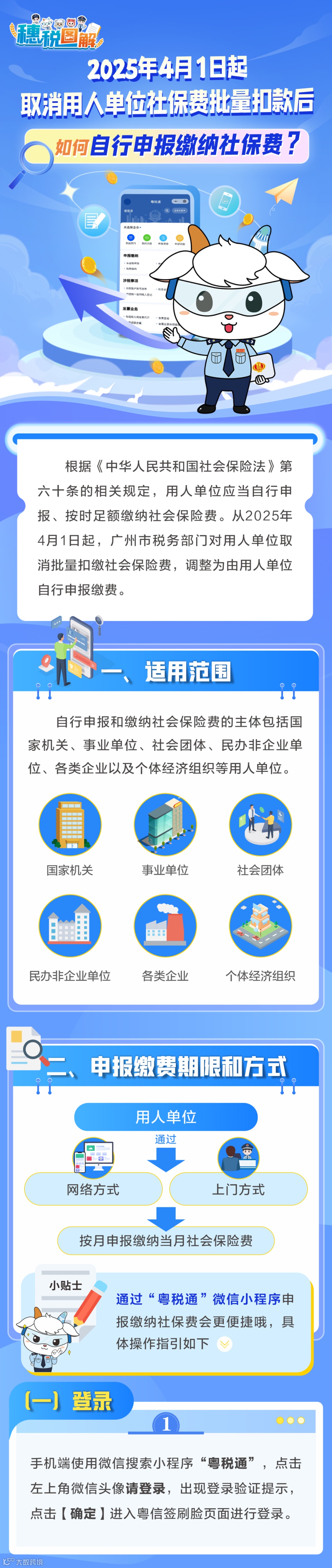 《通知》中明确,从2025年4月1日起,广州市税务部门对用人单位取消批量扣缴社会保险费,调整为由用人单位自行申报缴费。其中: