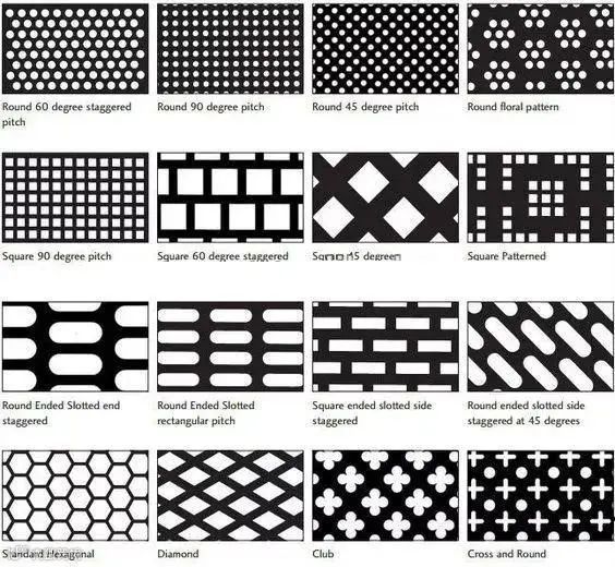 冲孔按孔洞规格主要有:长方孔、方孔、菱形孔、圆孔、长圆孔、六角形孔、十字孔、三角孔、长腰孔、梅花孔、鱼鳞孔、图案孔、八字网、人字孔、五角星形孔、不规则孔、起鼓孔、异型孔、百叶孔等。