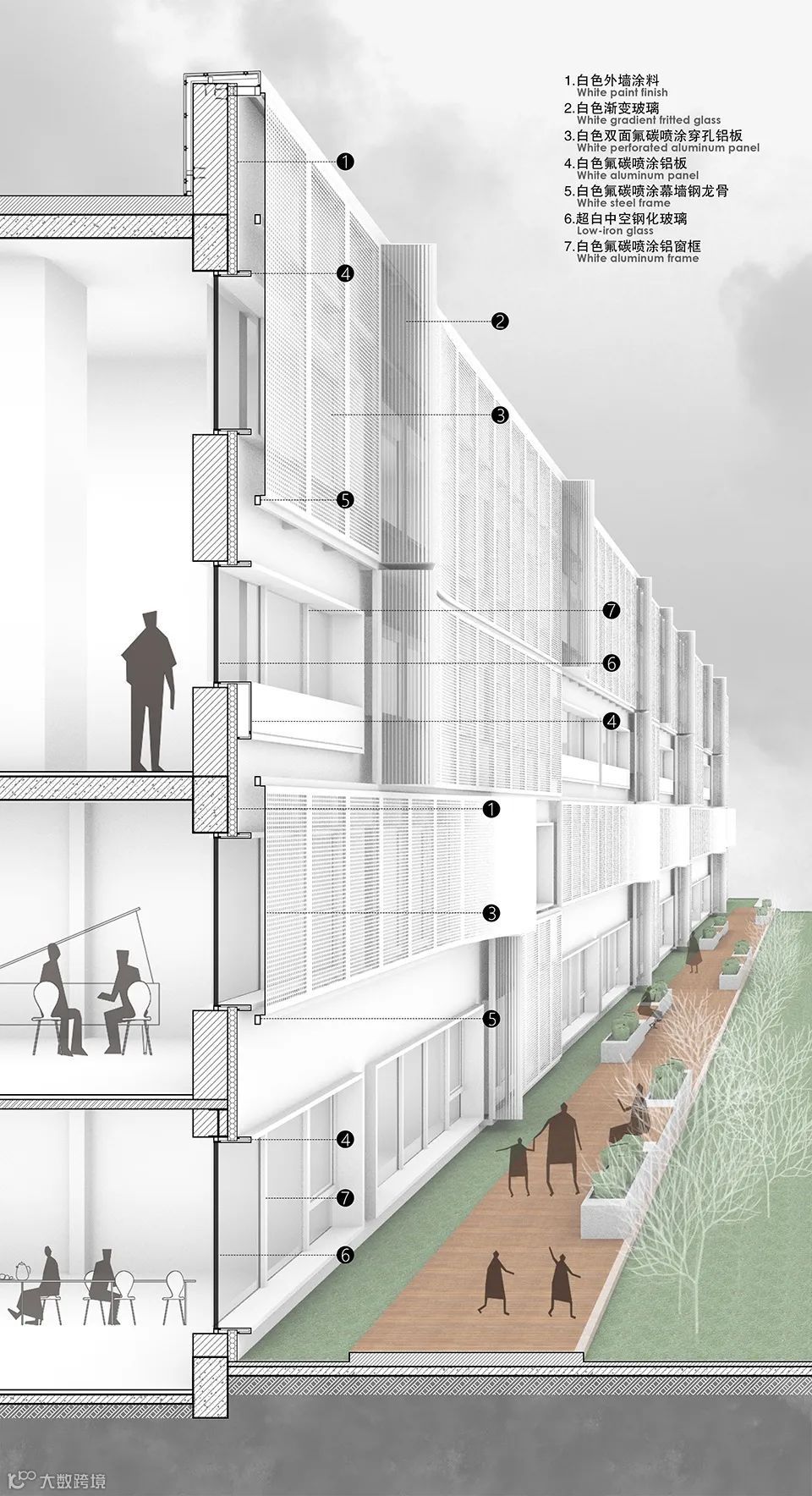 作为幕墙中最为重要和显著的元素,白色穿孔铝板组团被设计成起翘的形态,并且铝板的冲孔率随着起翘逐渐变小,过渡到实面铝板。