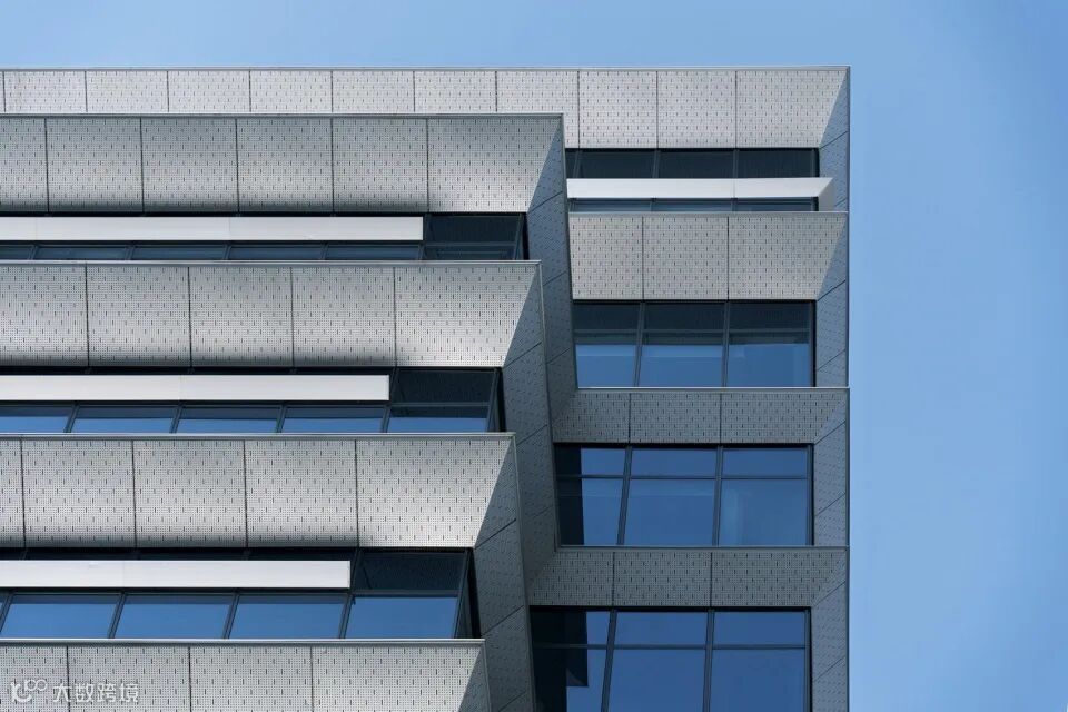 ⑤ 建筑物理环境均好,穿孔铝板大大降低了玻璃的遮阳系数,将刺眼的日光过滤成漫射光,从而减少了太阳辐射对室内的影响,可以帮助创造更有利的工作环境和稳定的室内温度。通风和透光性很好,哪怕最小的孔径只有0.5mm,也能满足室内需求,最重要的是能起到防盗效果;