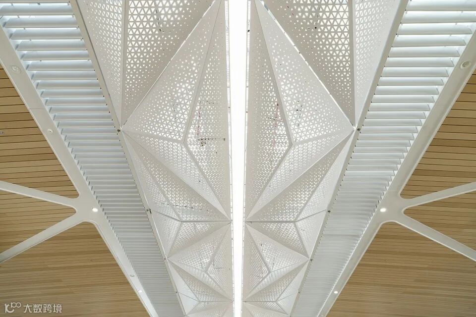 深圳宝安国际机场,长达1.2公里的天窗系统贯穿整个卫星厅,三棱锥渐变三角形穿孔铝板过滤太阳直射光,温暖的光线在仿木纹三角形天花图案的映衬下,以丰富的光影效果为旅客提供方向引导。