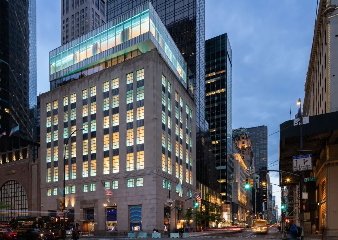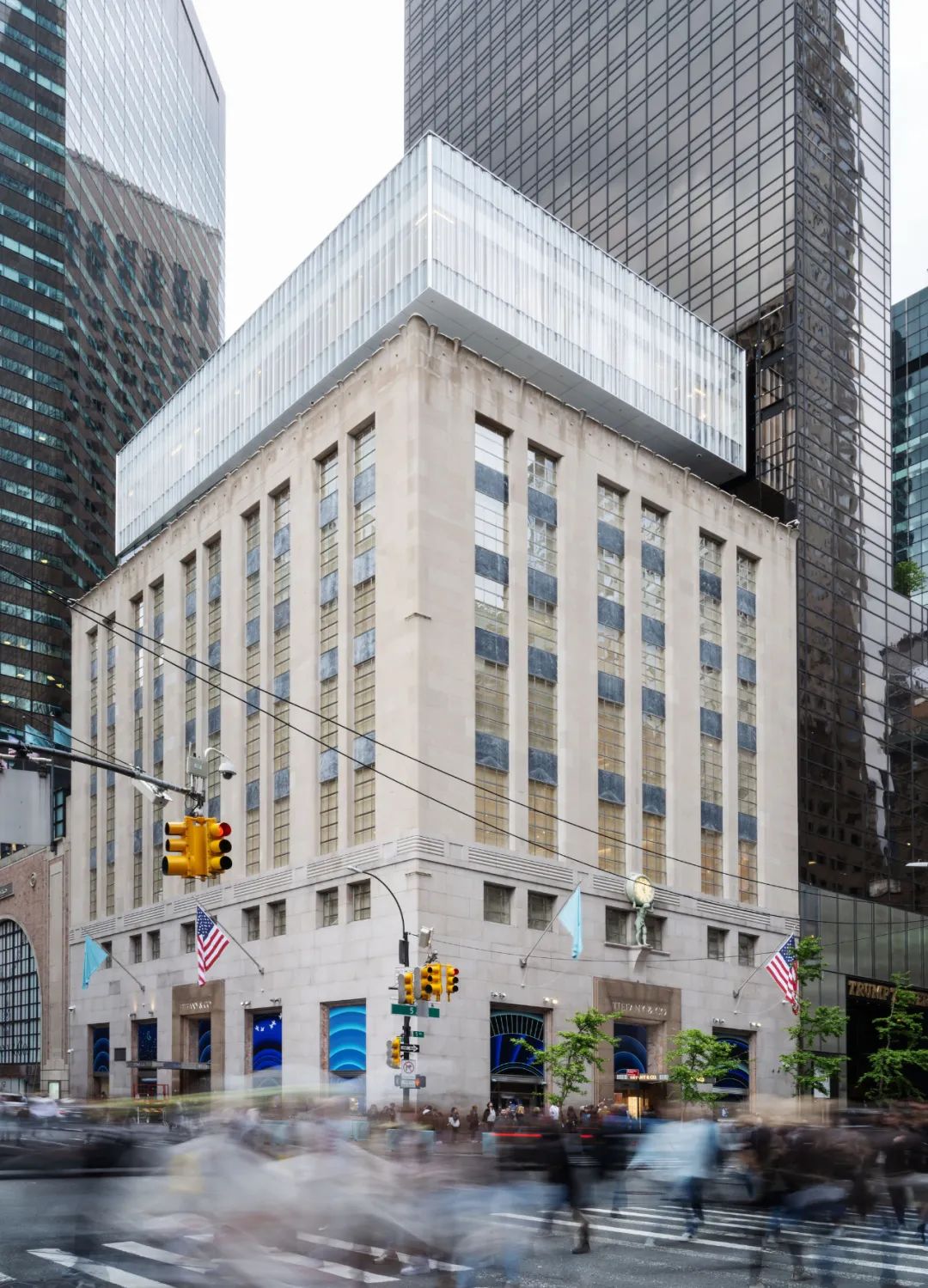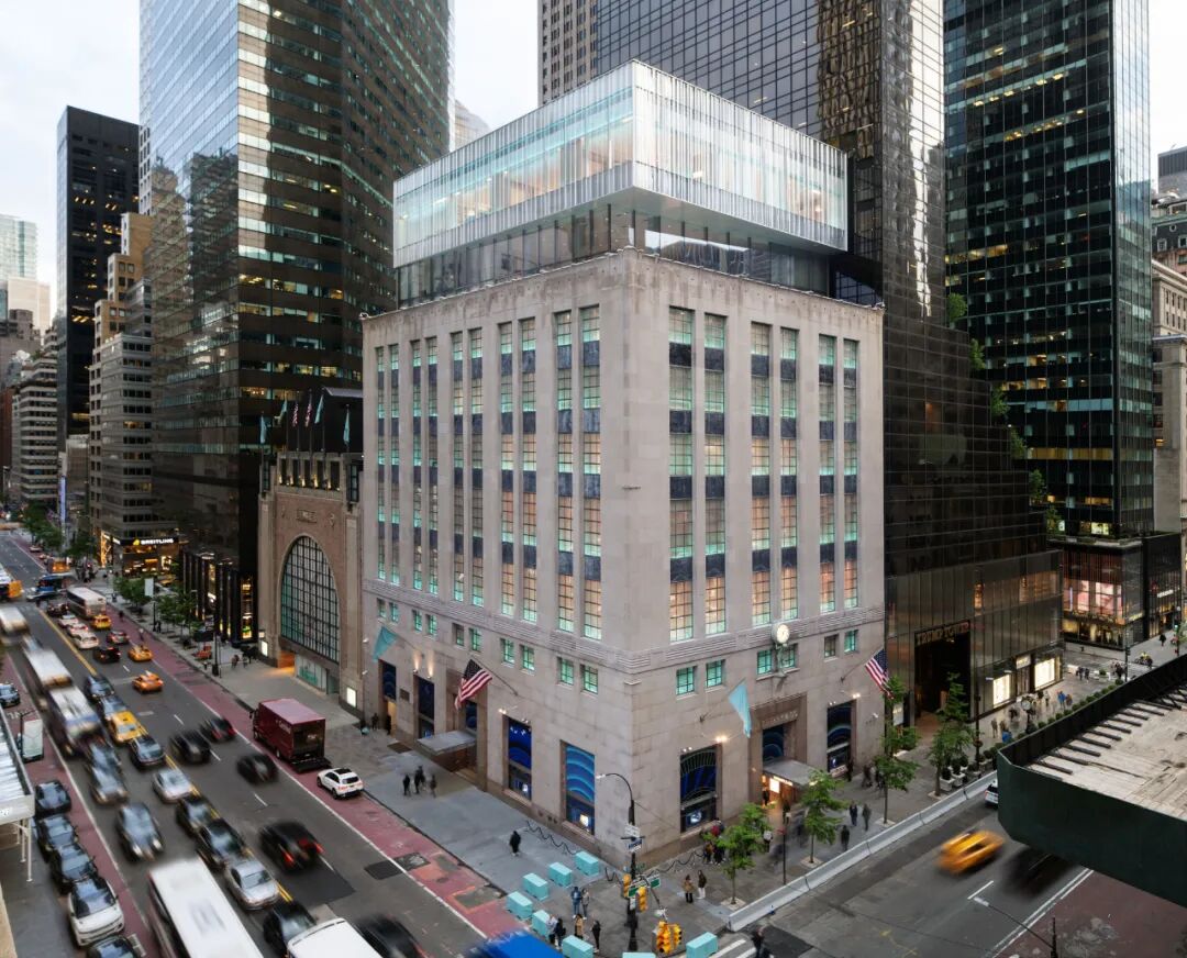 Resembling a soft curtain, the façade is an antidote to the severe glass buildings that tower over the Landmark that contributes a different texture to the sober form of the existing limestone building and glass box addition. The new jewelry box (or “blue box” when lit at night in Tiffany Blue) floating above the original structure is a symbolic start to a renewed identity of the flagship and the brand.