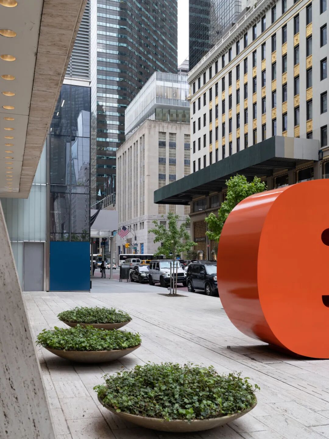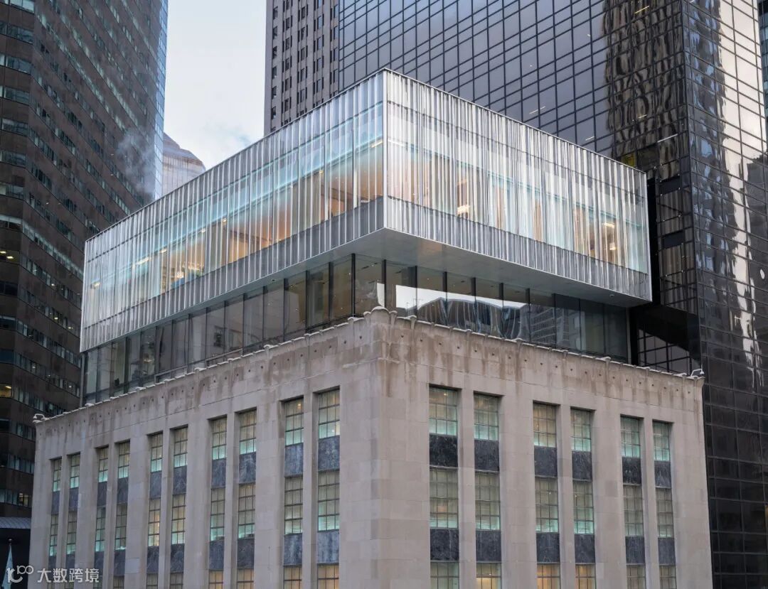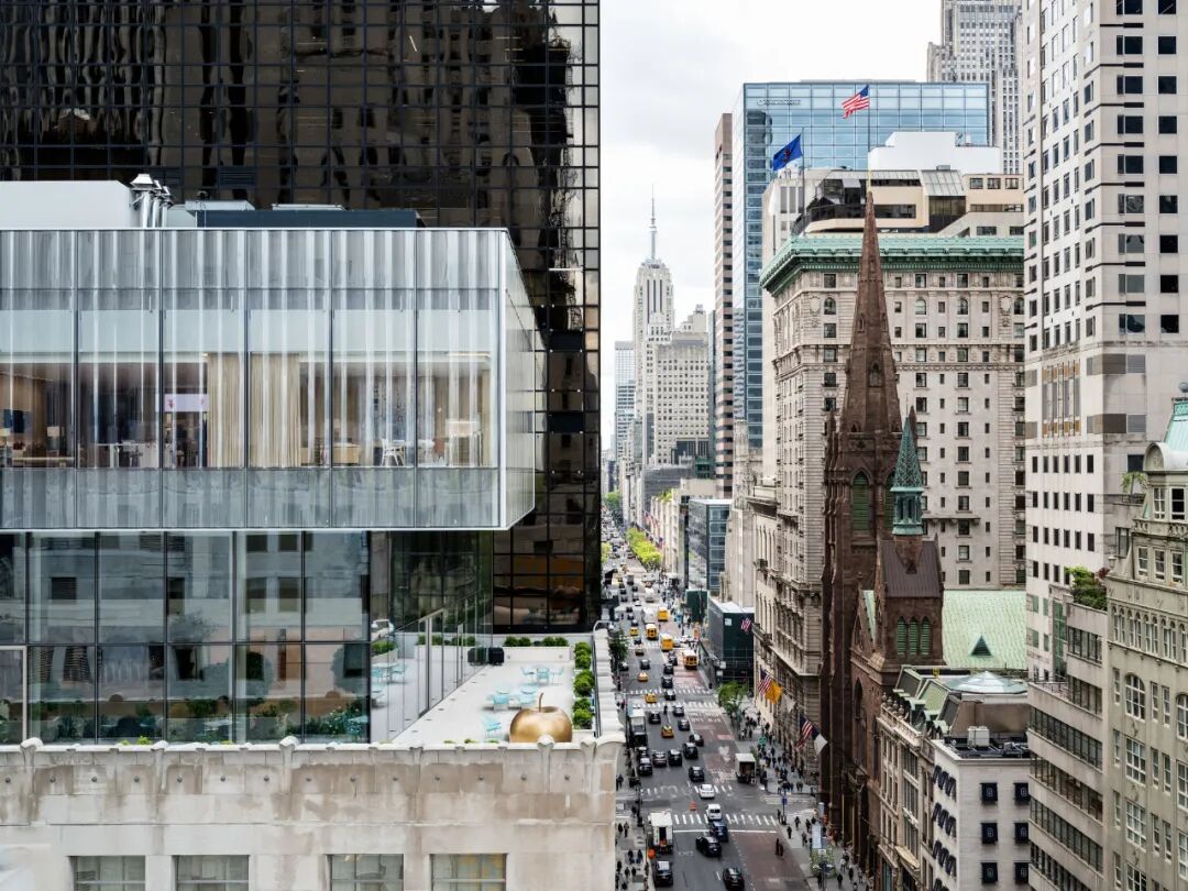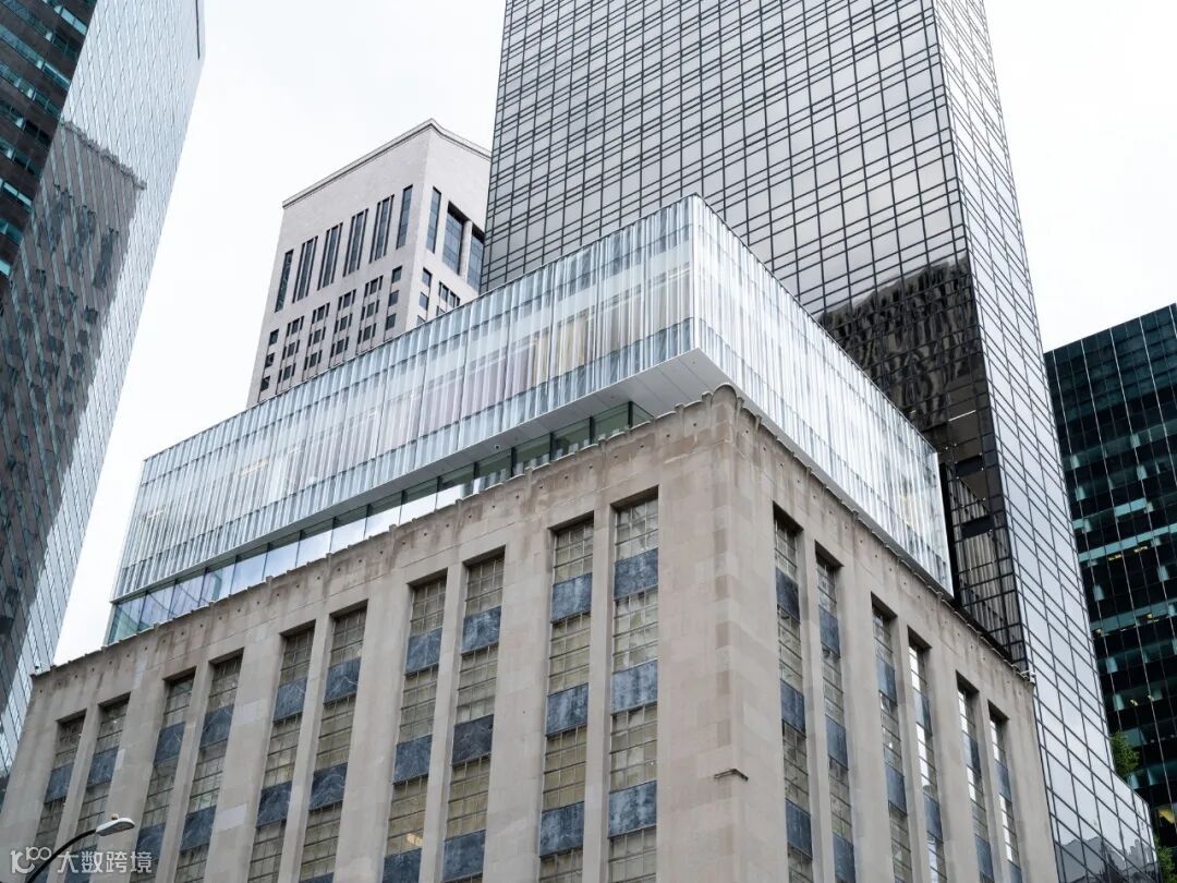 Resembling a soft curtain, the façade is an antidote to the severe glass buildings that tower over the Landmark that contributes a different texture to the sober form of the existing limestone building and glass box addition. The new jewelry box (or “blue box” when lit at night in Tiffany Blue) floating above the original structure is a symbolic start to a renewed identity of the flagship and the brand.