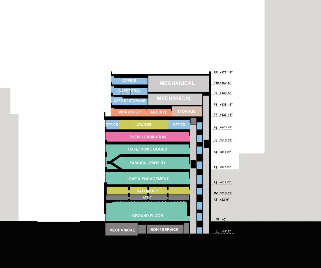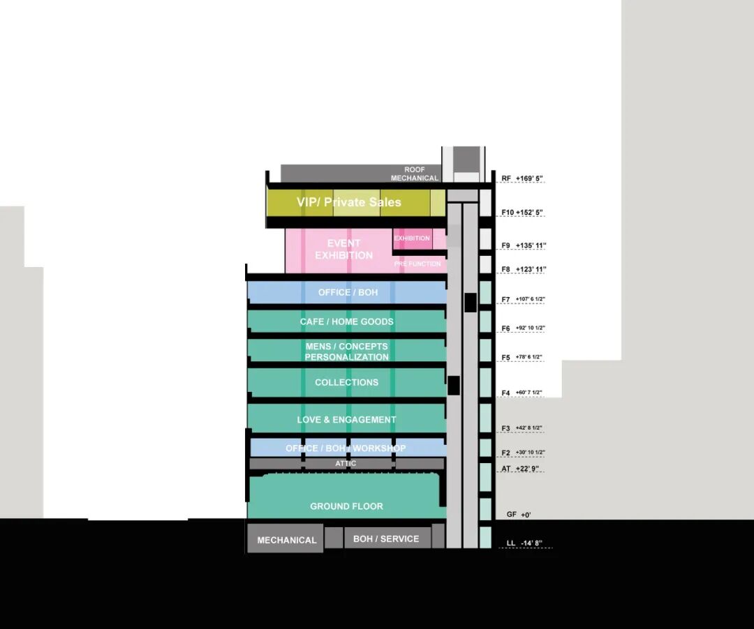727 Fifth Avenue presented 10-stories entirely dedicated to retail, at a scale that not dissimilar to the typical urban department store. While a department store is inherently diverse, with a wide variety of brands in shop-in-shops, here, a single brand occupies the multi-story building. How could the renovation break the potential monotony of shopping all Tiffany products?