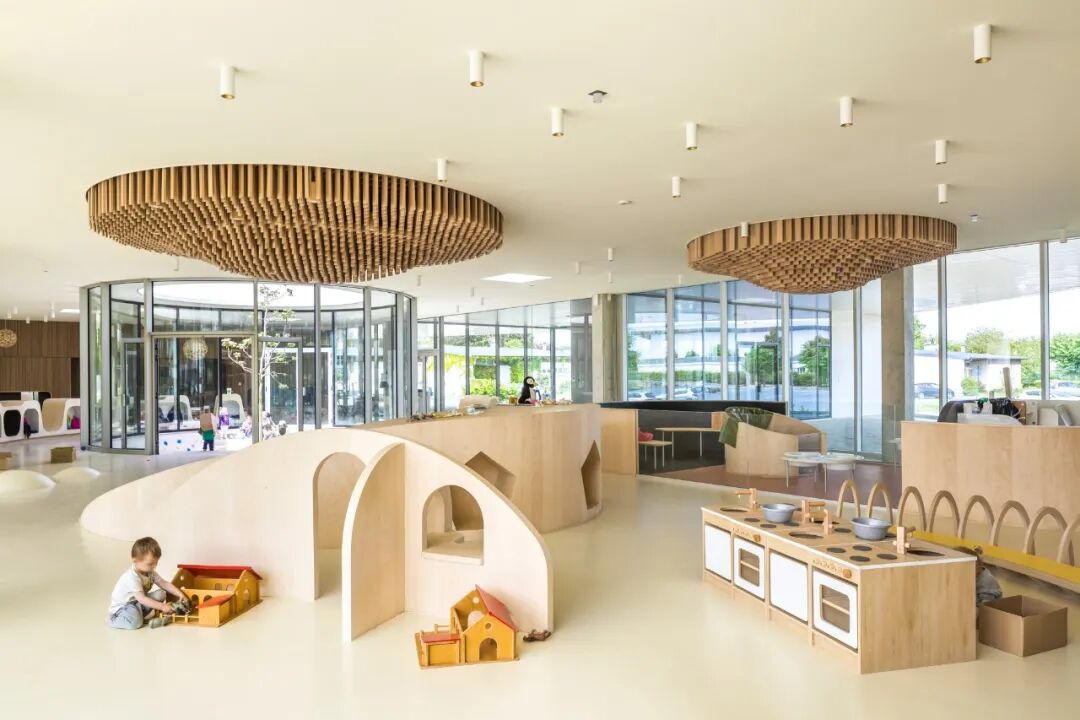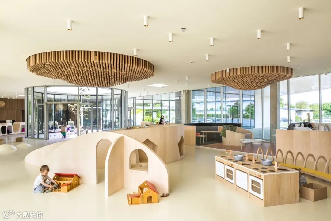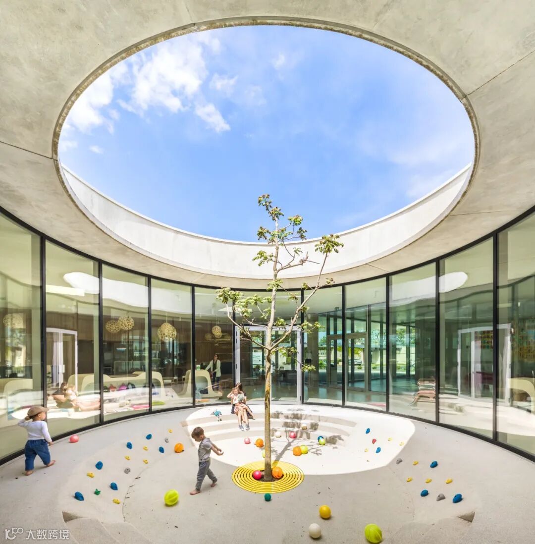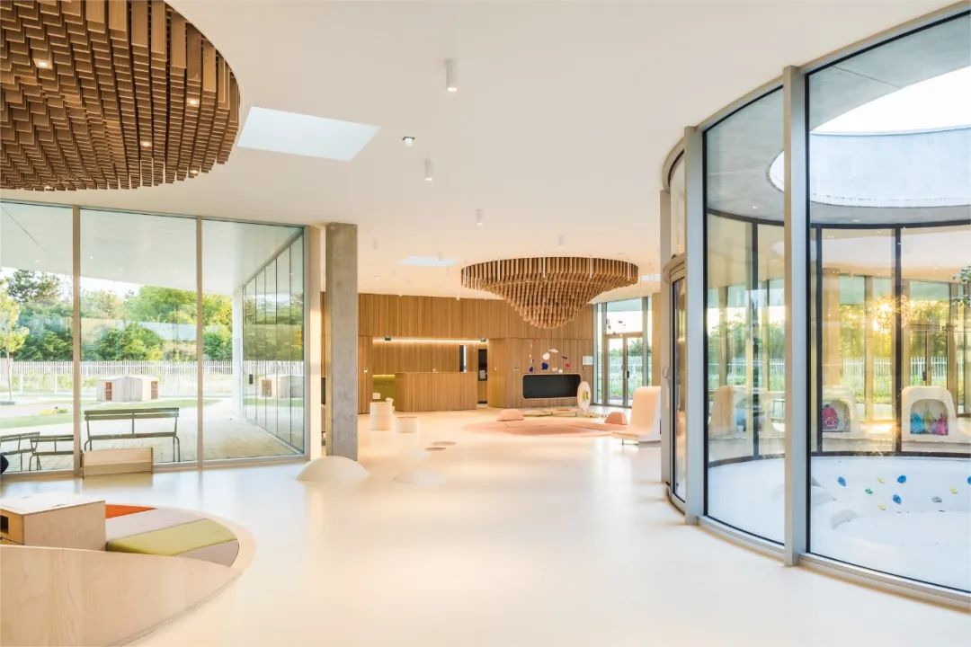 该建筑从地面上略微抬高,有一个交叉体量,利用了地块的四个方向。该计划提供了美丽的开放空间,欢迎花园、操场、露台和前院。无遮挡的公园景观使得将自然带入项目的中心成为可能,从而使其参与到儿童的感官唤醒中。