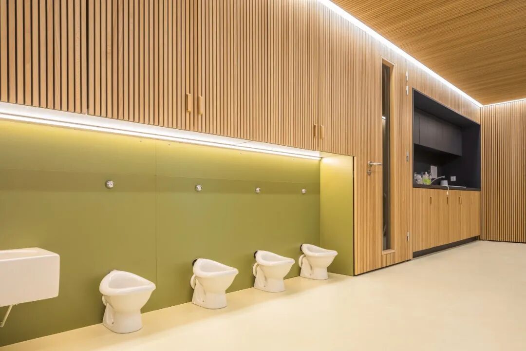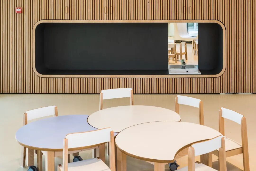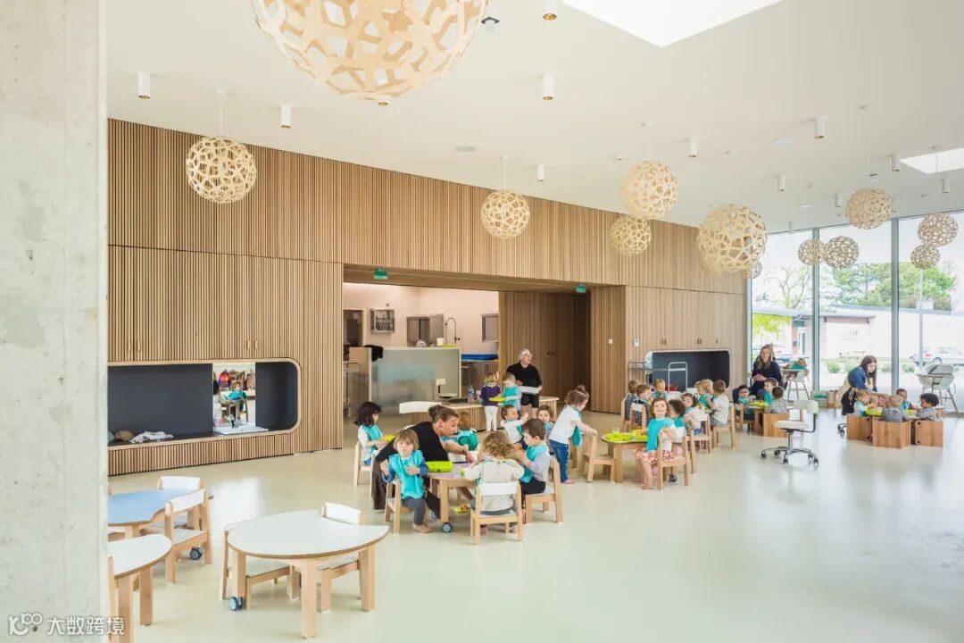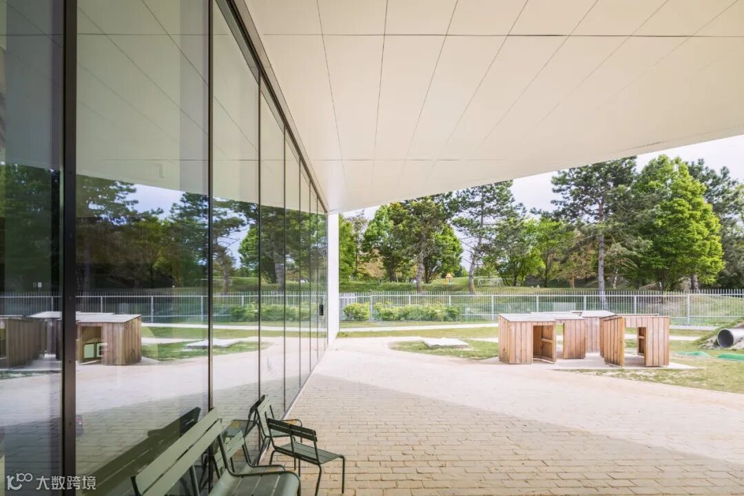 该建筑从地面上略微抬高,有一个交叉体量,利用了地块的四个方向。该计划提供了美丽的开放空间,欢迎花园、操场、露台和前院。无遮挡的公园景观使得将自然带入项目的中心成为可能,从而使其参与到儿童的感官唤醒中。