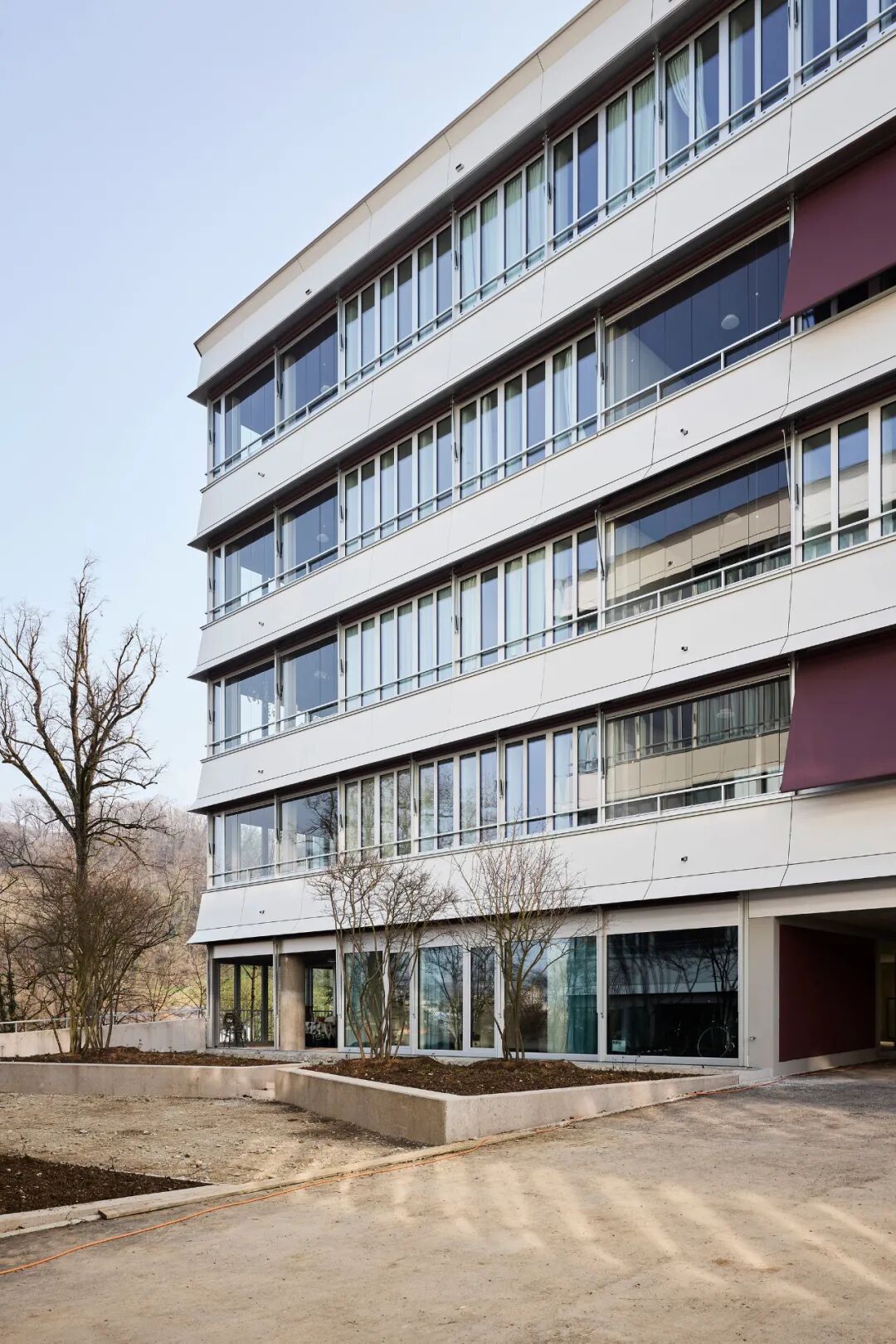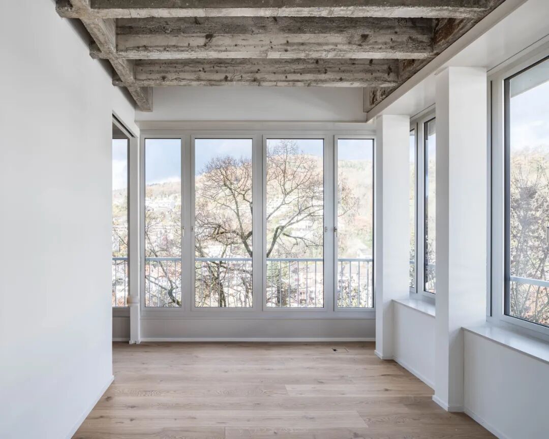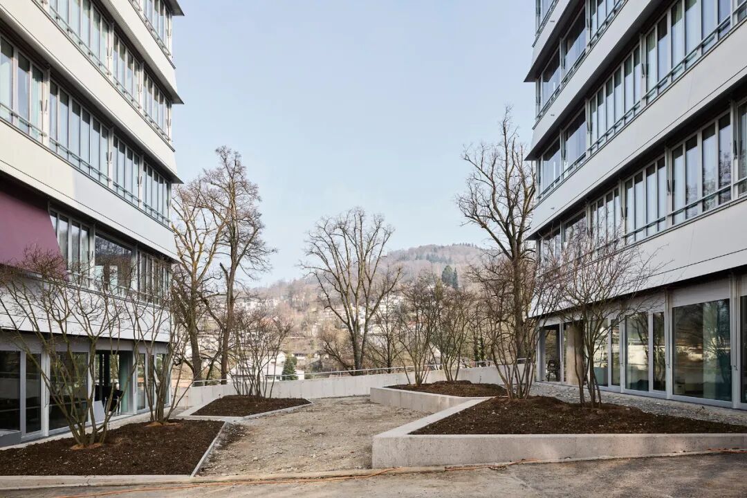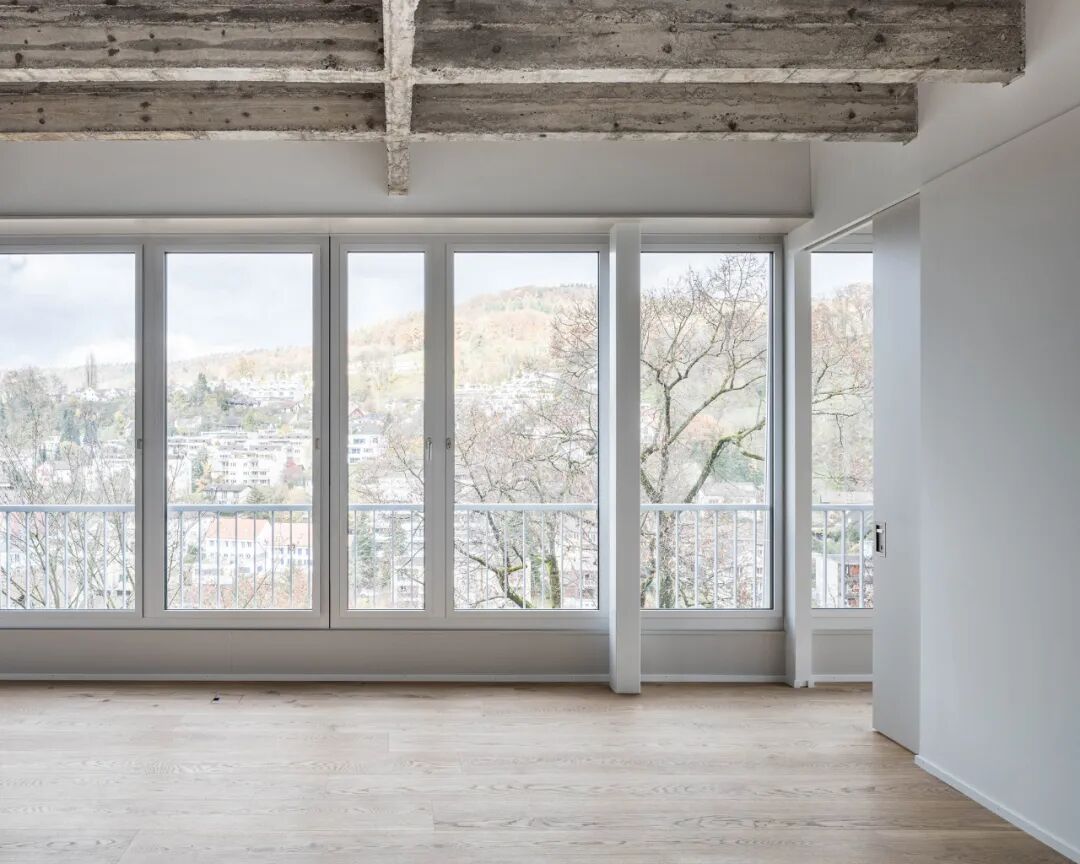 A villa of the founders and the large industrial site bear witness to the former glamour of the location. Somewhat peripherally, on the wooded hillside facing the Limmat, stand four pavilion-like extension buildings from the 1960s. Thanks to a successful competition in 2010, the filigree office structure could be converted into 78 condominiums and occupied in 2022.