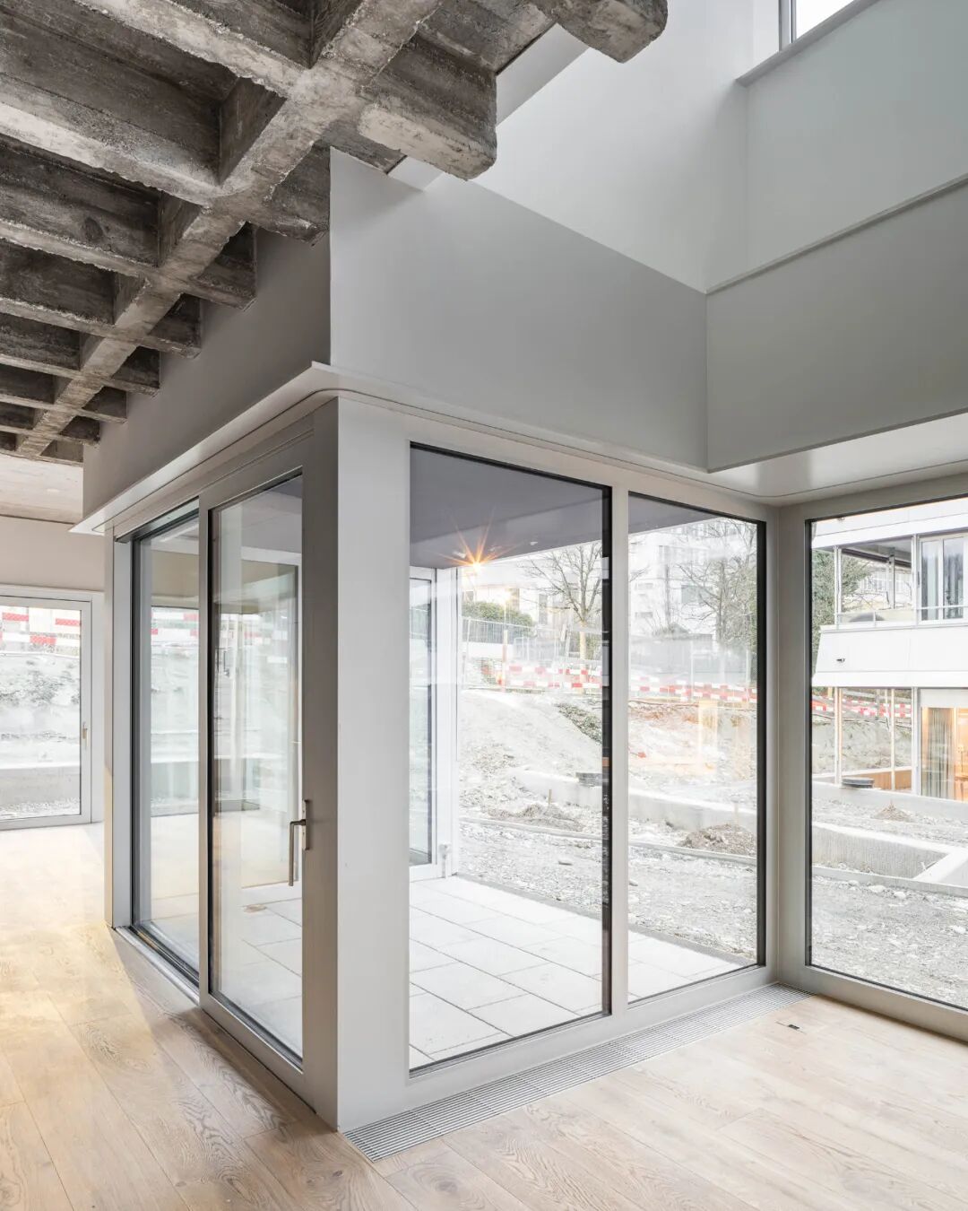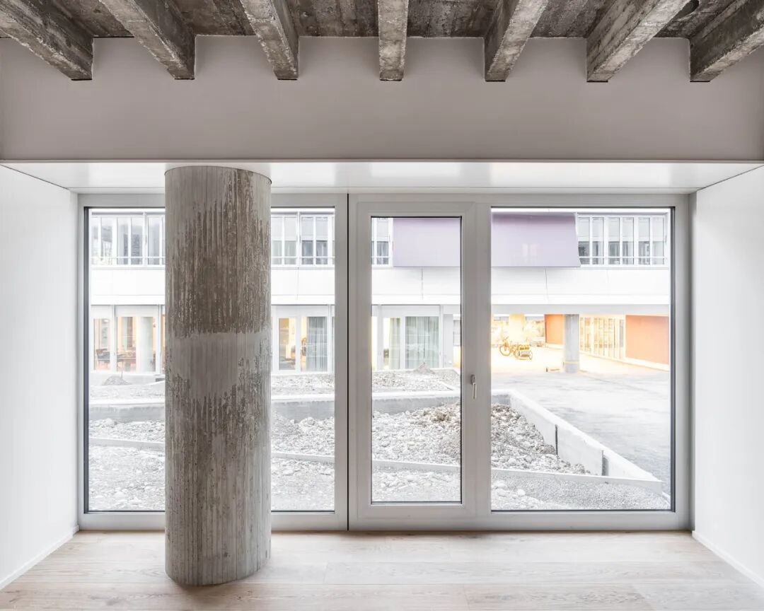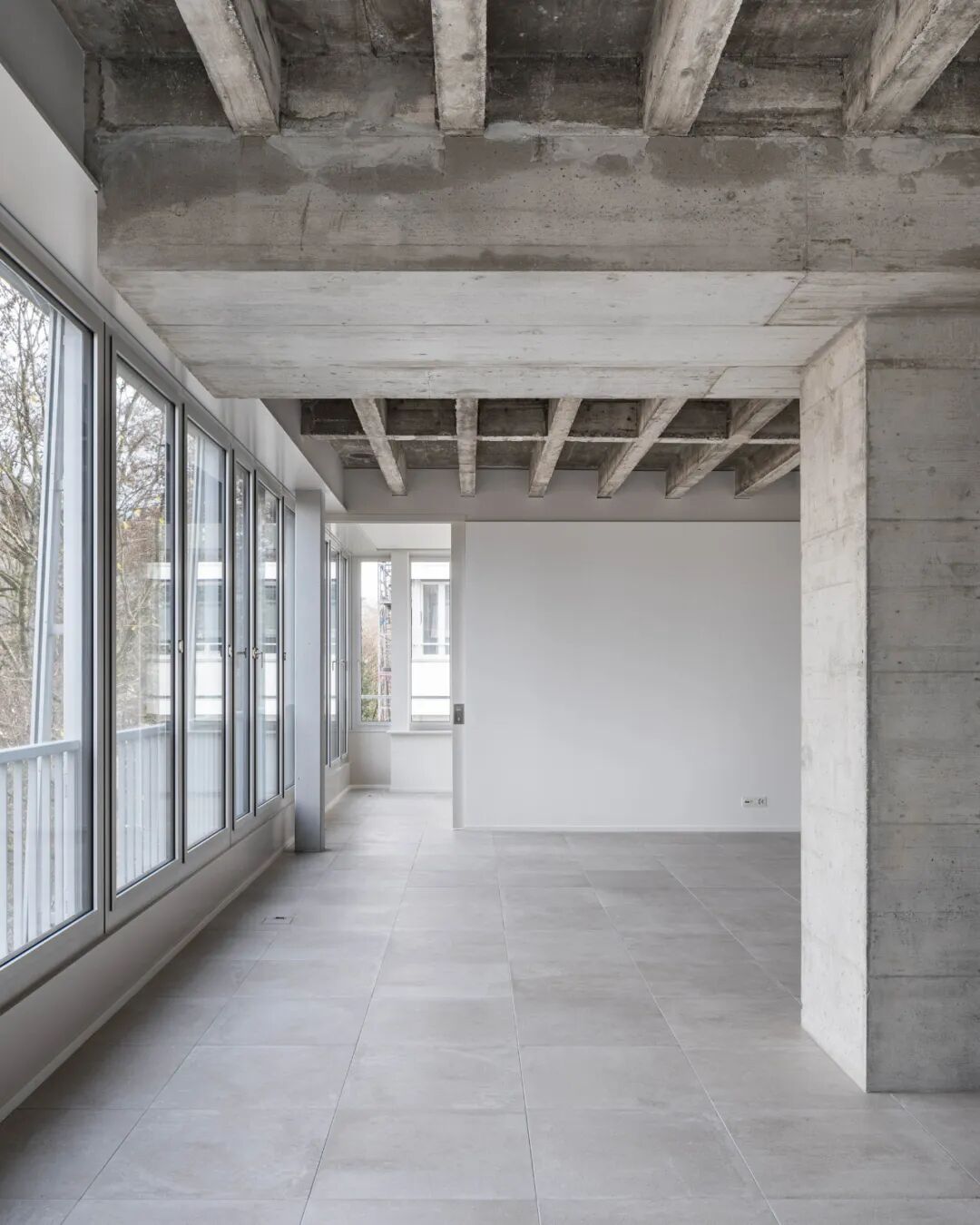 The theme of the enfilade is continued in the spacious flats, and the structurally necessary interventions in the concrete cassette ceiling also manifest themselves in the form of massive, room-structuring columns and partition walls for the flats.