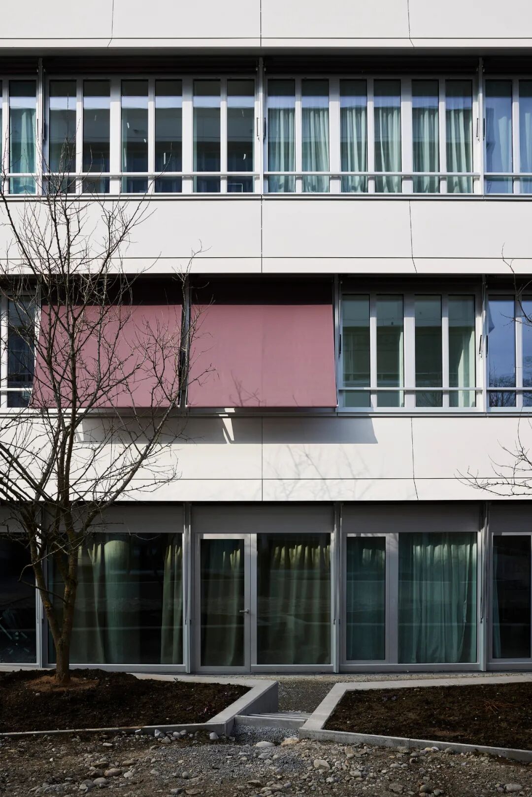 In contrast, a filigree, apronlike façade with a dynamic ballet of textile marquees winds around the buildings and brings back some of the old glory. Thanks to the preservation of the building structure, the site-specific context of the river space persists and a seamless chapter in Baden's urban development has been continued.