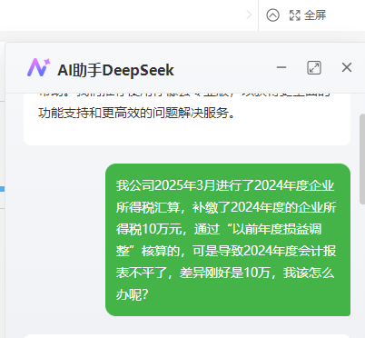 2️⃣ 输入 "我公司2025年3月进行了2024年度企业所得税汇算,补缴了2024年度的企业所得税10万元,通过“以前年度损益调整”核算的,可是导致2025年度会计报表不平了,差异刚好是10万,我该怎么办呢? "