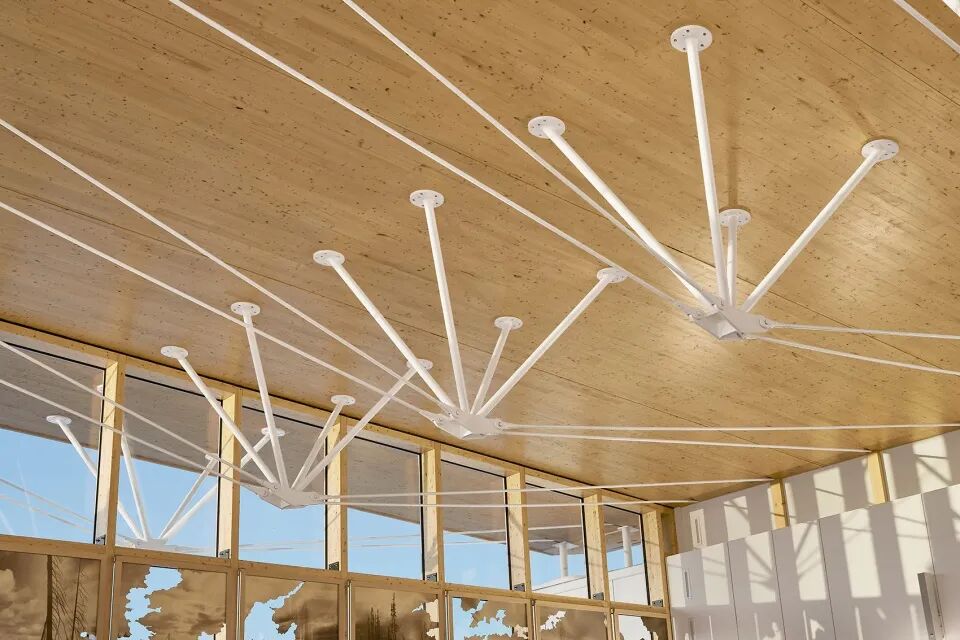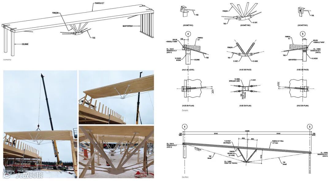 屋顶采用工程木材和钢构件,跨度12m的应力CLT面板通过两端木柱支撑,柱子以高强度钢棒加固,从中心连接到四壁。